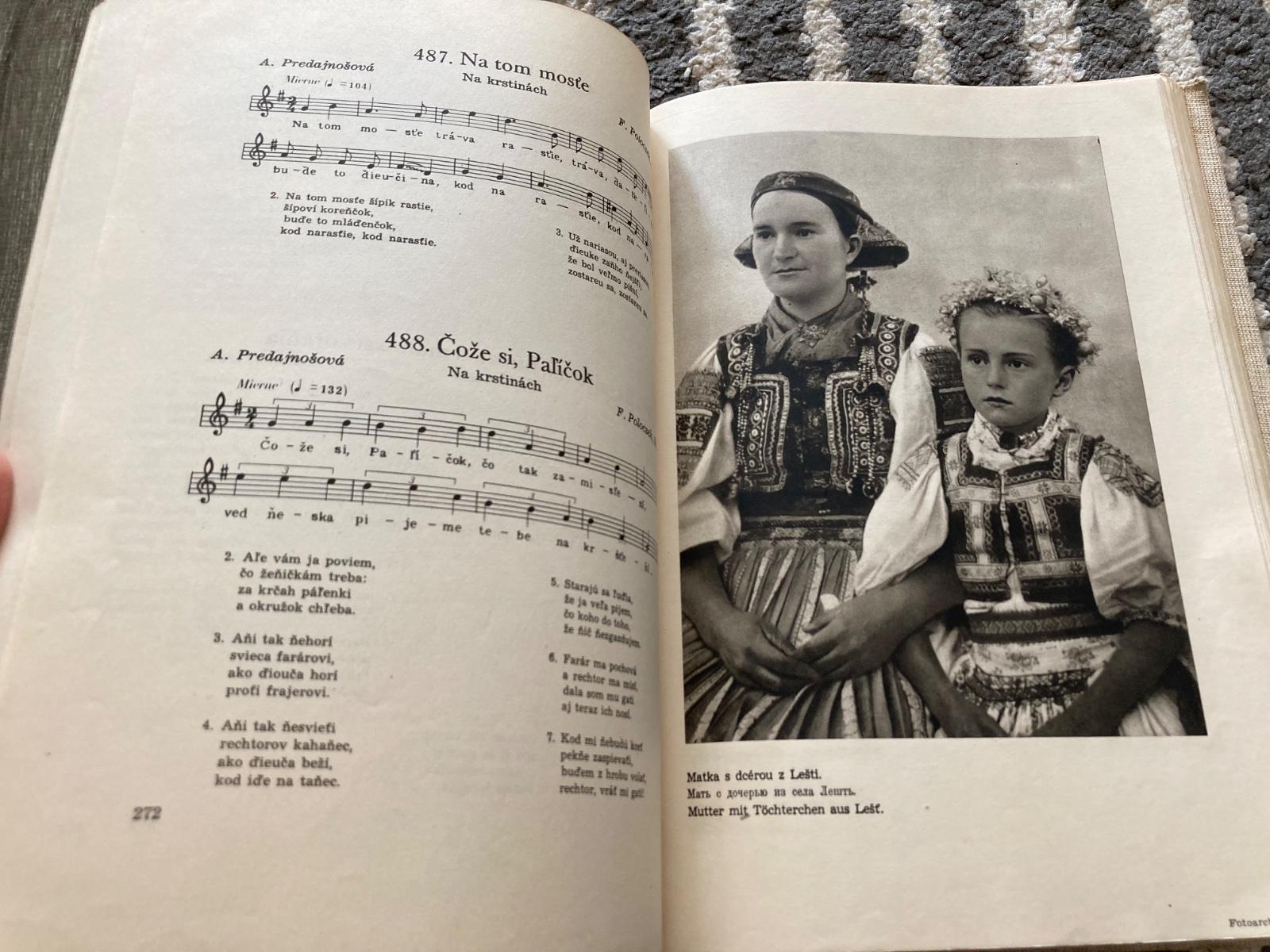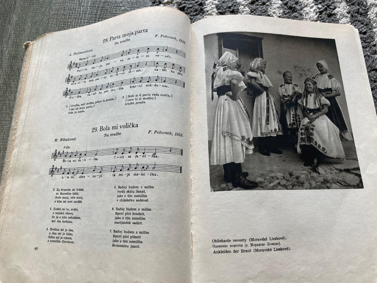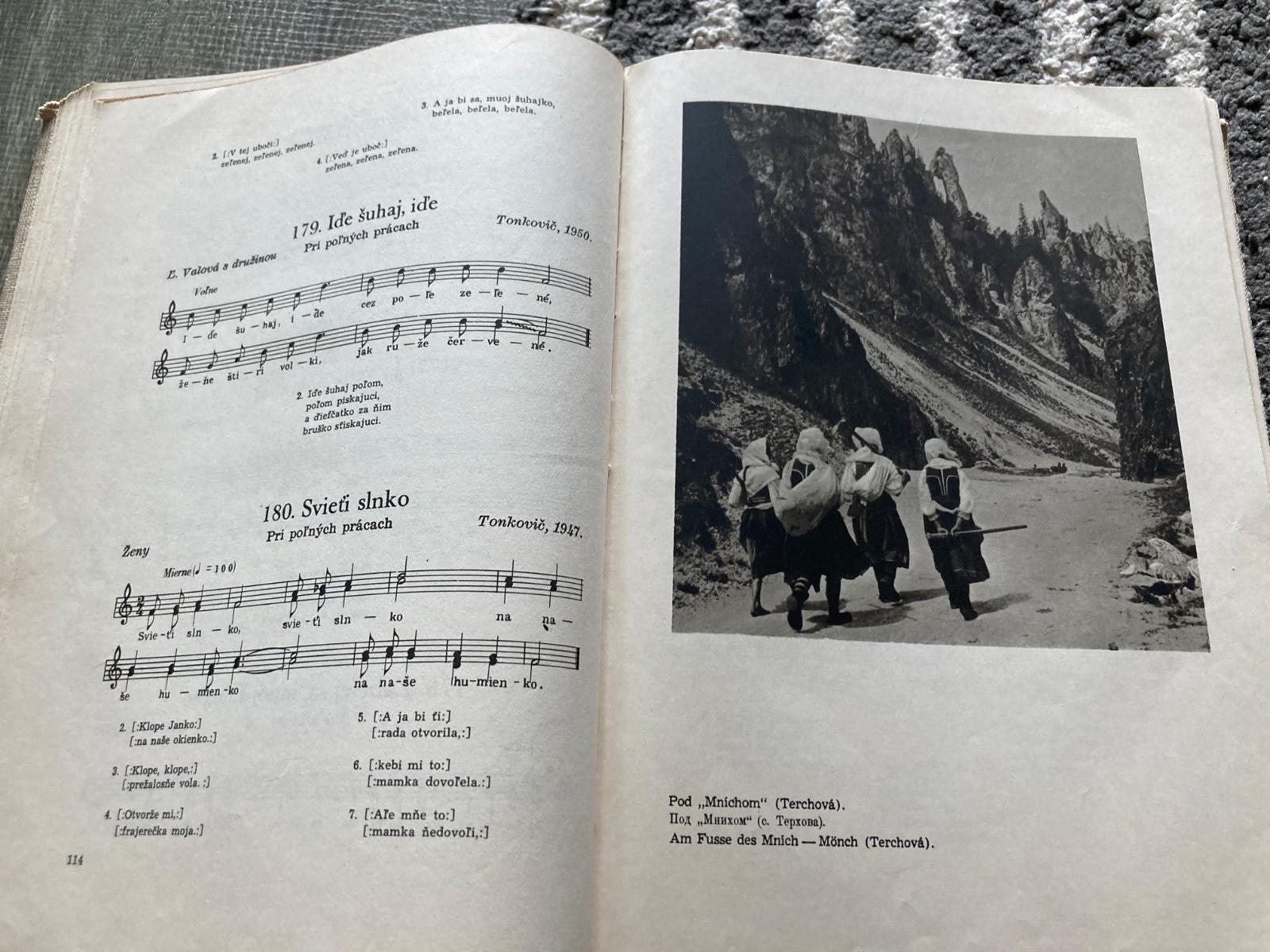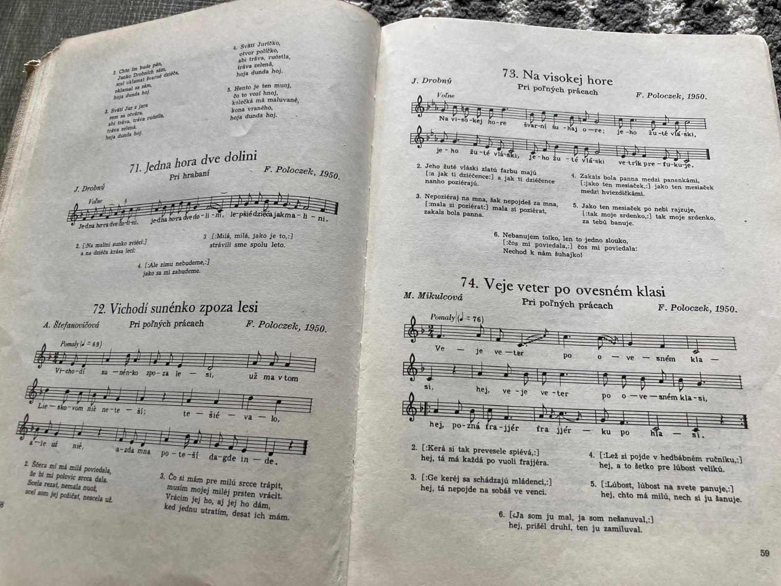 pekný stav, krásna retro kniha vo veľkom formáte, zachovalá s nádhernými fotografiami, vydanie z roku 1953, pekné strany, vpredu len jedna pečiatka a pri nej krátky vpis, vpredu dvakrát napísané číslo inak bez akýchkoľvek vpisov, chýba papierový prebal, obal mierne opotrebovaný, zriedkavý výskyt na trhu, obsahuje veľmi veľa ľudových piesní