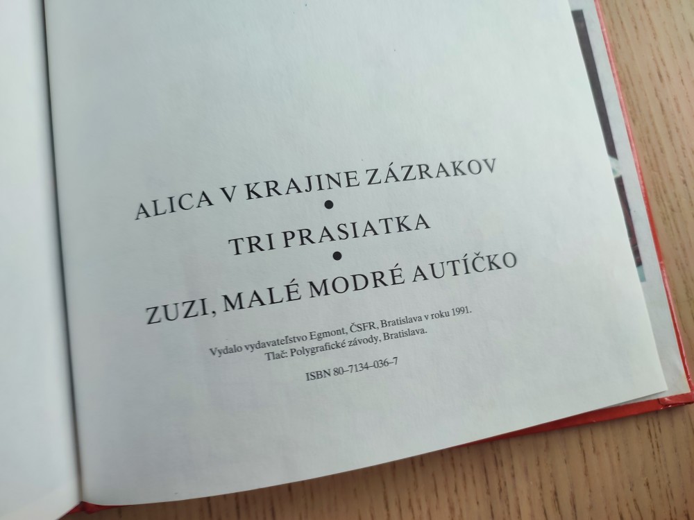 Walt Disney rozpravky 3v1, červená: Alica v krajine zázrakov, Zuzi malé modré autíčko, Tri prasiatka; vydavateľstvo Egmont. Vnútri bezchybná, zvonku má vyblednutú hranu od svetla, ako bola založená v knižnici. 12 Eur