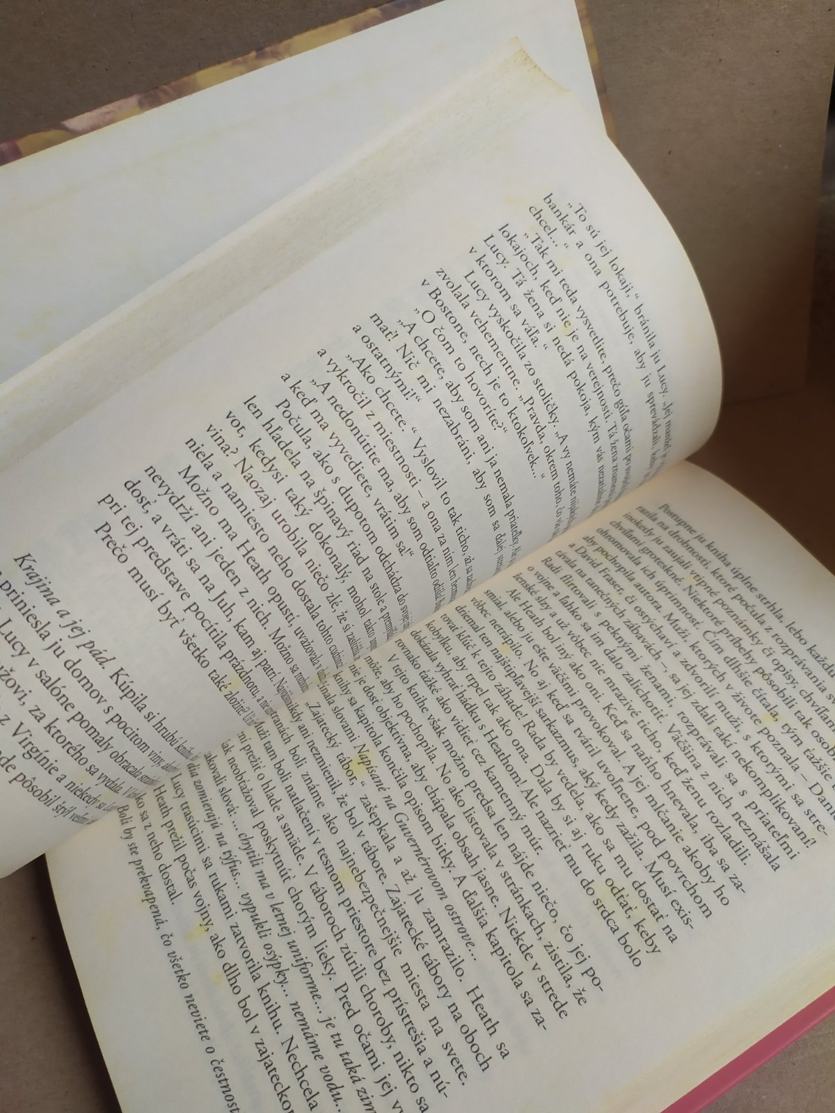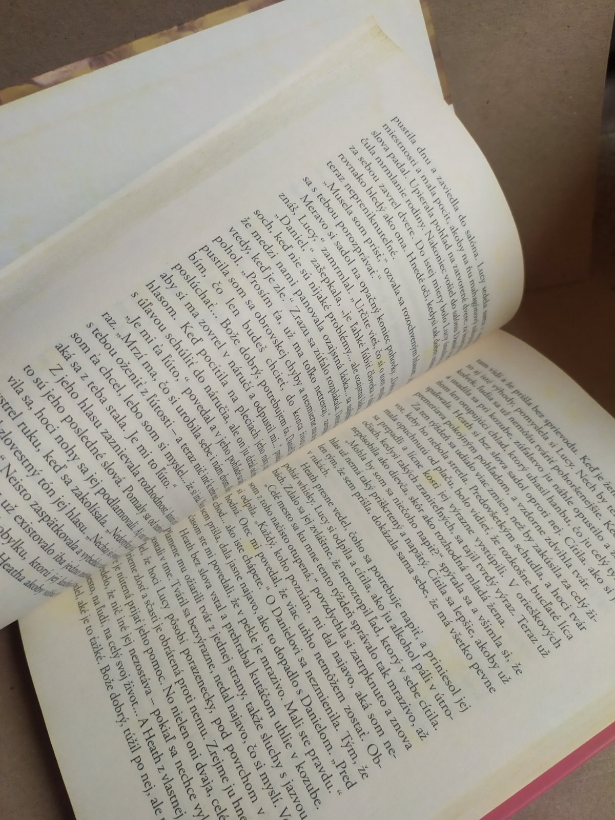 kniha má zo začiatku a ku koncu dosť fľakaté stránky, vo vnútri sú tiež fľaky, viď foto., čítaniu to nebráni