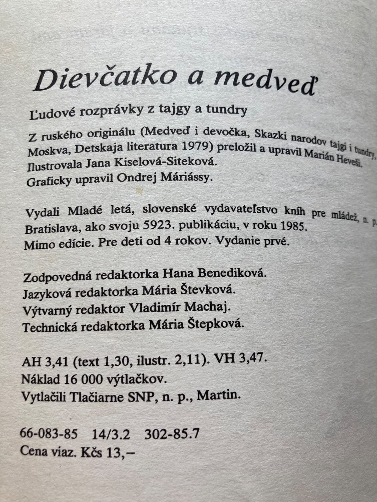 🔹Kniha Dievčatko a medveď z roku 1985 je zbierka ľudových rozprávok z tajgy a tundry. Súbor rozprávok o zvieratách a ľuďoch z drsných podmienok severu, kde hlavným motívom je často stretnutie malého dievčatka s medveďom, ktorý jej pomáha.