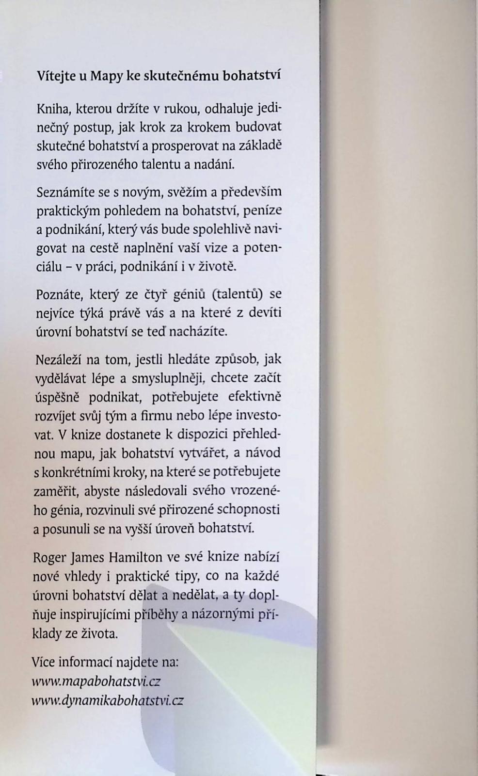 Ještě než začnete přemýšlet, jak lépe podnikat nebo více vydělat, potřebujete pochopit podstatu skutečného bohatství, zjistit, jaký je váš přirozený talent a nadání – v čem jste Génius, a zjistit, jak si teď stojíte. Pak můžete jasně a s důvěrou vykročit na vlastní cestu za naplněním své vize, poslání a potenciálu bohatství. Tato skvělá knížka Rogera Jamese Hamiltona se vám stane praktickým průvodcem při vašem postupu z jedné úrovně bohatství, úspěchu a naplnění na tu další s mnohem většími možnostmi.
