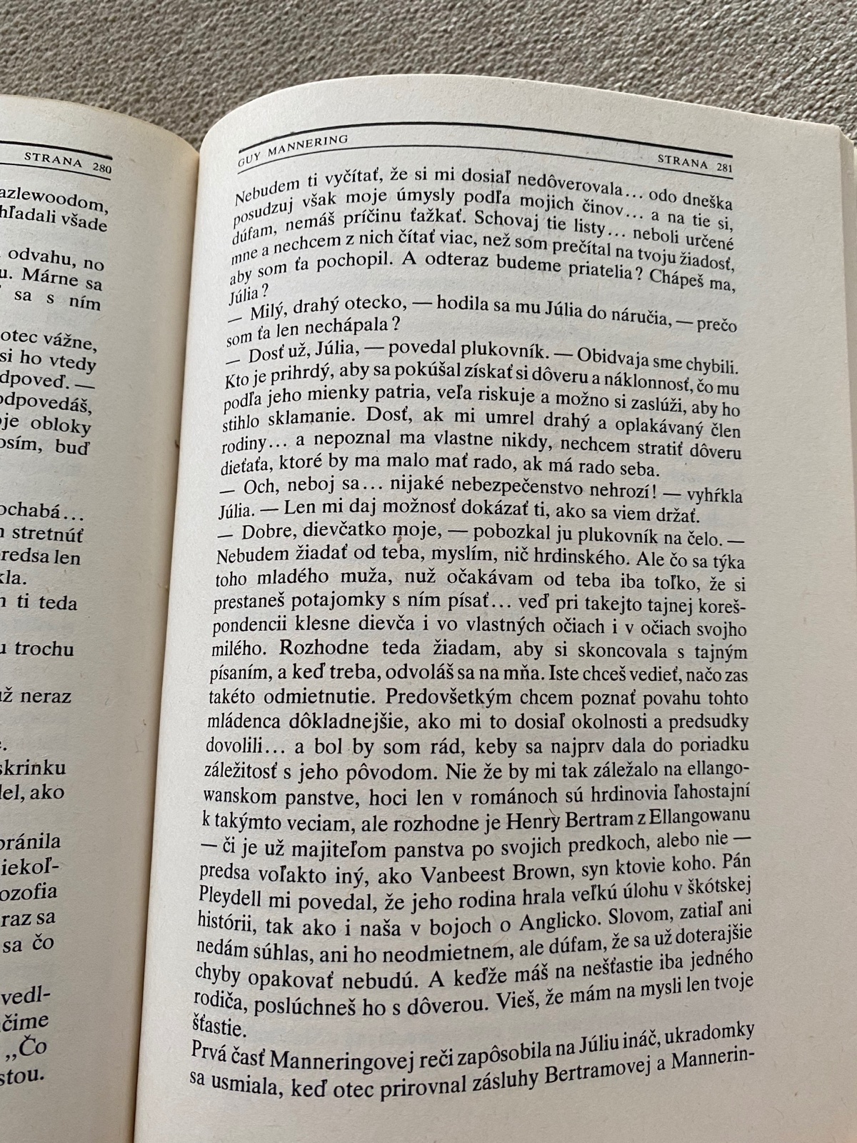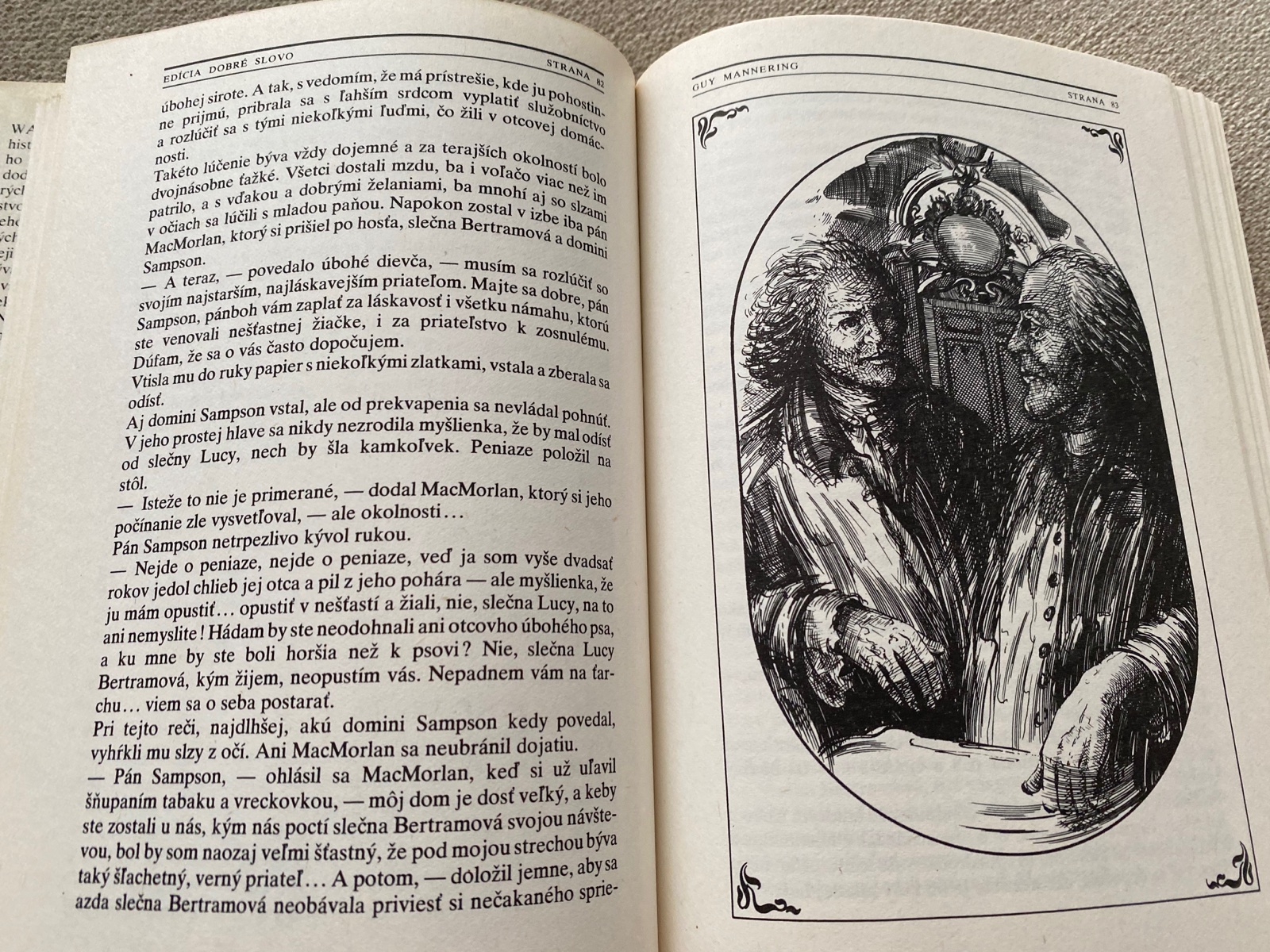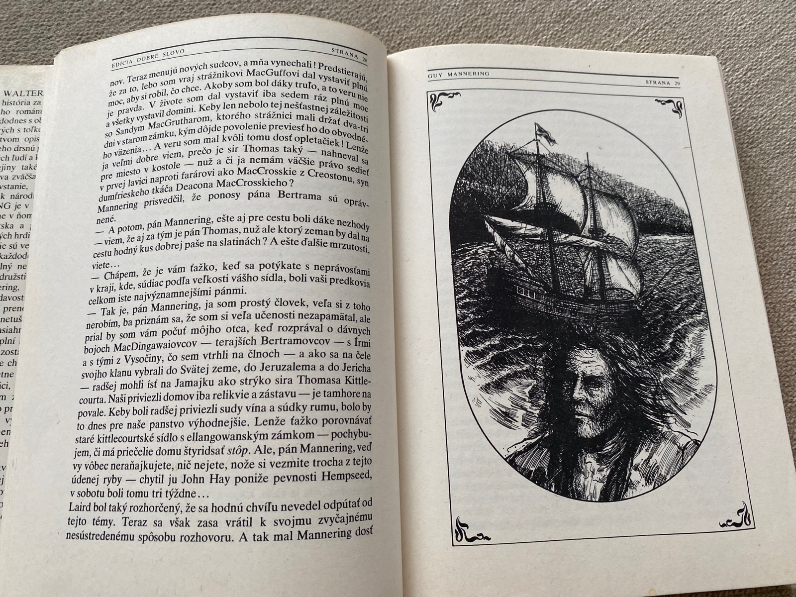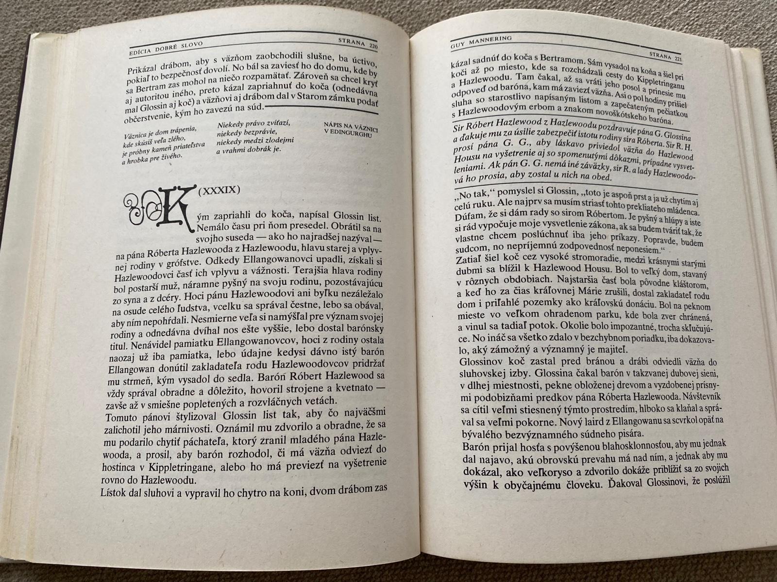 Historický román privádza čitateľov do starého Škótska. Mladý Angličan Guy náhodou prenocuje na Ellangowanskom zámku a netuší, ako veľmi tento kraj a jeho ľudia zasiahnu do jeho života..... obal, 330 strán, tvrdá väzba
