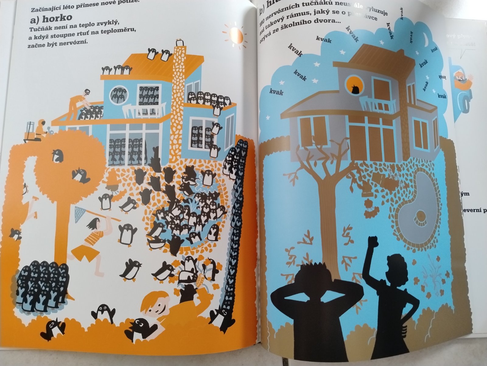 Co udělat, když vám po domě capkají nejdřív desítky a pak stovky nezvaných hostů s oranžovými nožkami a v černobílém fráčku, místo mluvení kvakají, neustále se zavírají do koupelny a ke všemu bývají dost nervózní, když mají hlad? Jak uspořádat a uživit 4 x 15, 12 x 12 nebo 6 x 6 x 6 tučňáků, když je jich každý den o jednoho víc? Po pár měsících mamince docházejí zásoby, sestra má chuť na tučňáčí paštiku a tatínkovi se z toho neustálého přepočítávání motá hlava… Kdo je záhadný odesílatel živých balíčků a proč je vlastně posílá? Neobyčejně legrační obrazový matematický příběh s ekologickou pointou. K použití pro celou rodinu!