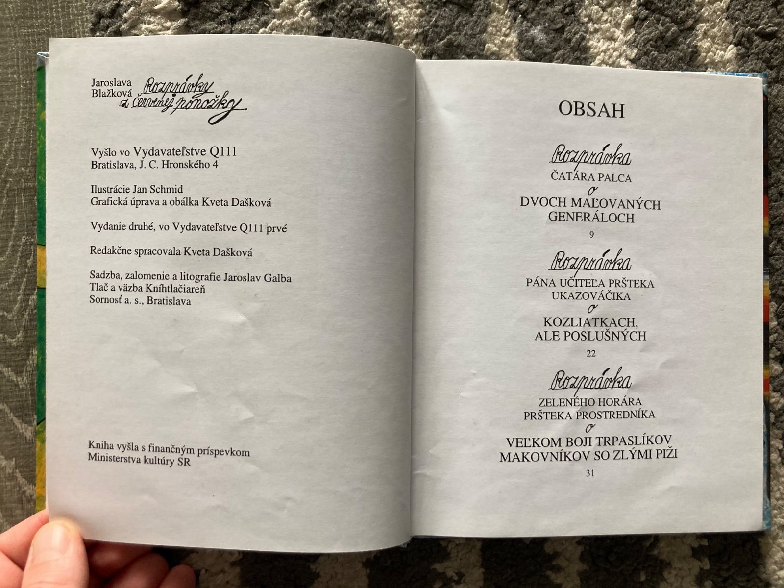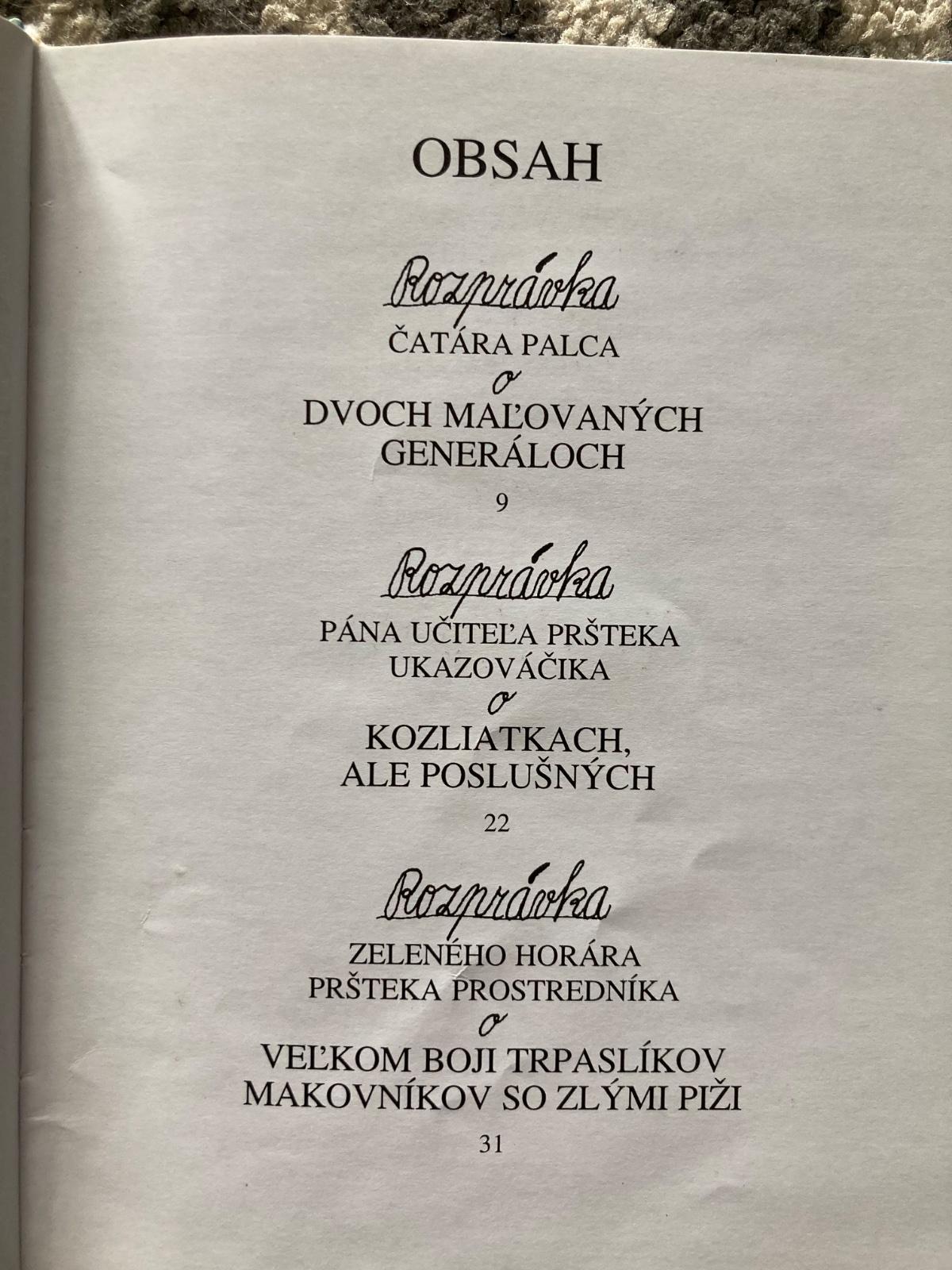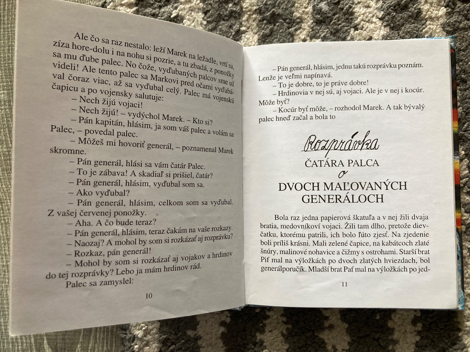 📌Všetky deti v škôlke po obede spia, len Marek má otvorené oči. A tu hľa, z červenej ponožky, ktorú vystrčil spod deky, sa mu vykľuval palec. Vlastne dvaja medovníkoví generáli, ktorí mu porozprávajú rozprávku. A tak to ide po celý týždeň. Zakaždým nový prst, zakaždým nový rozprávač, zakaždým nová úžasná a vtipná rozprávka.