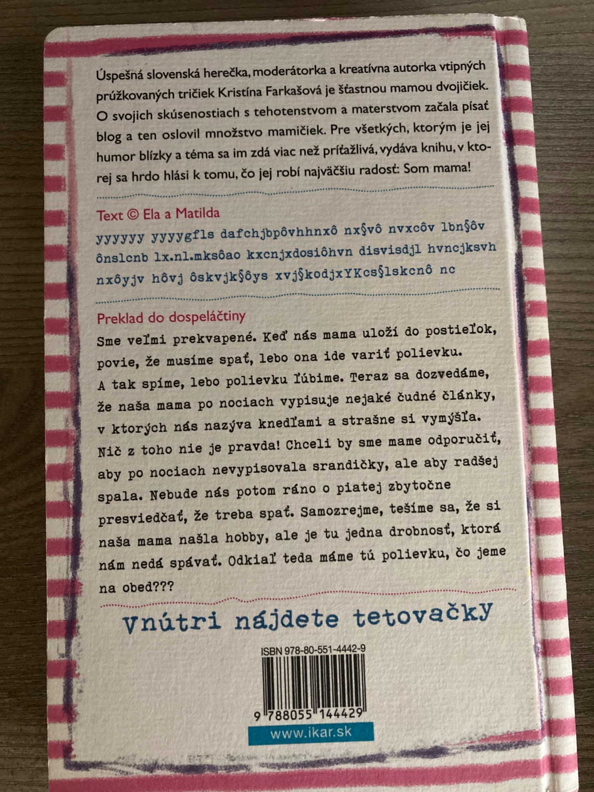 Posuniem 1x čítanú knihu od Kristíny Farkašovej Tormovej. V knihe sú komplet nepoužité tetovačky. Veľmi príjemné čítanie pre každú mamičku :)