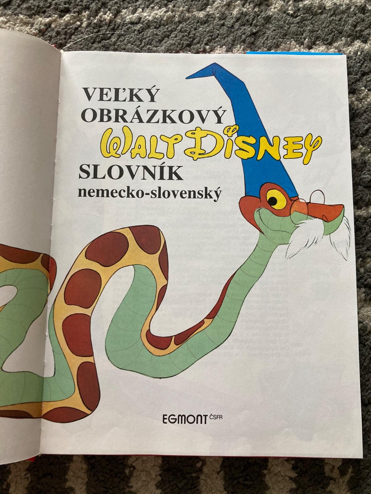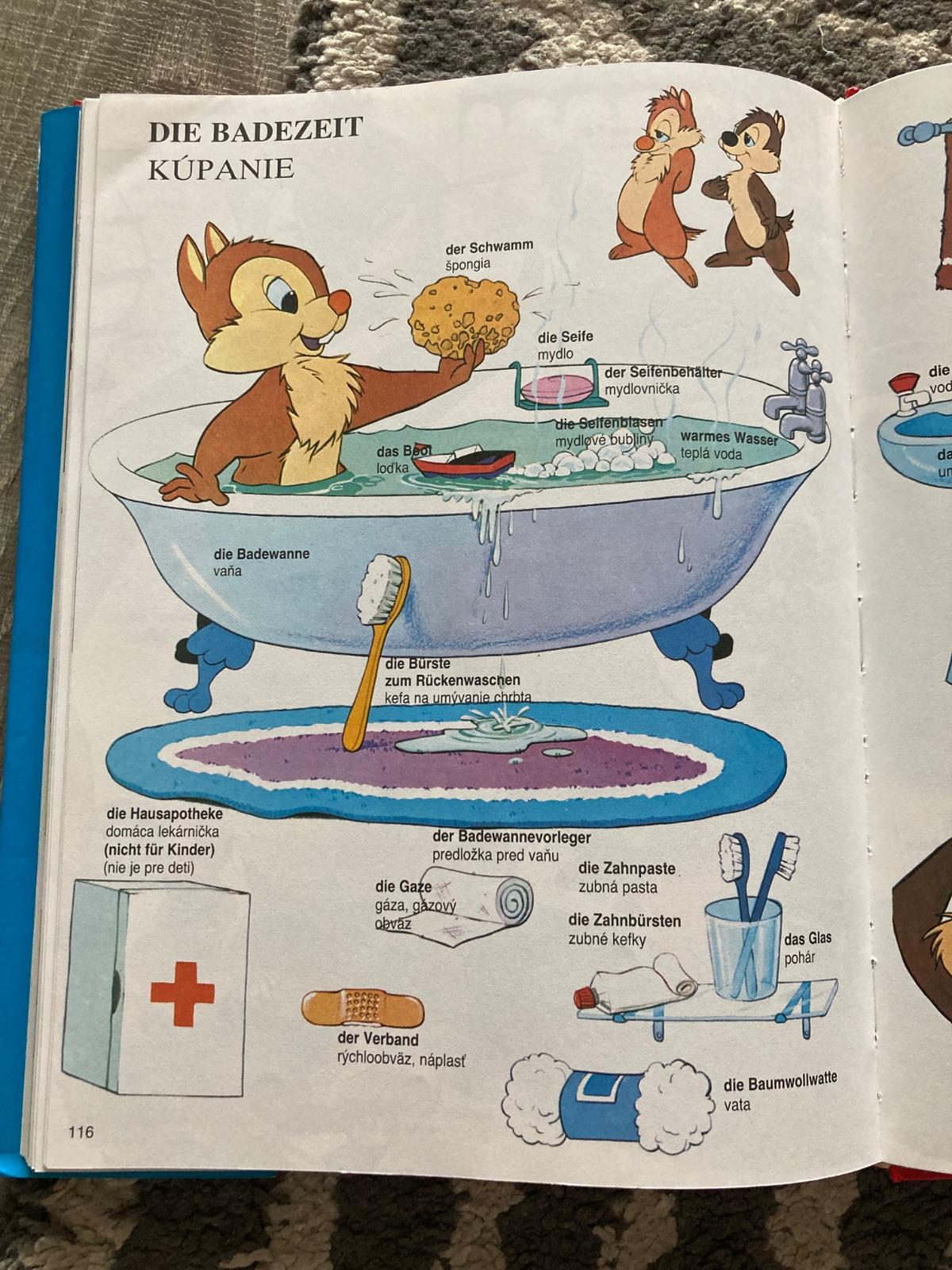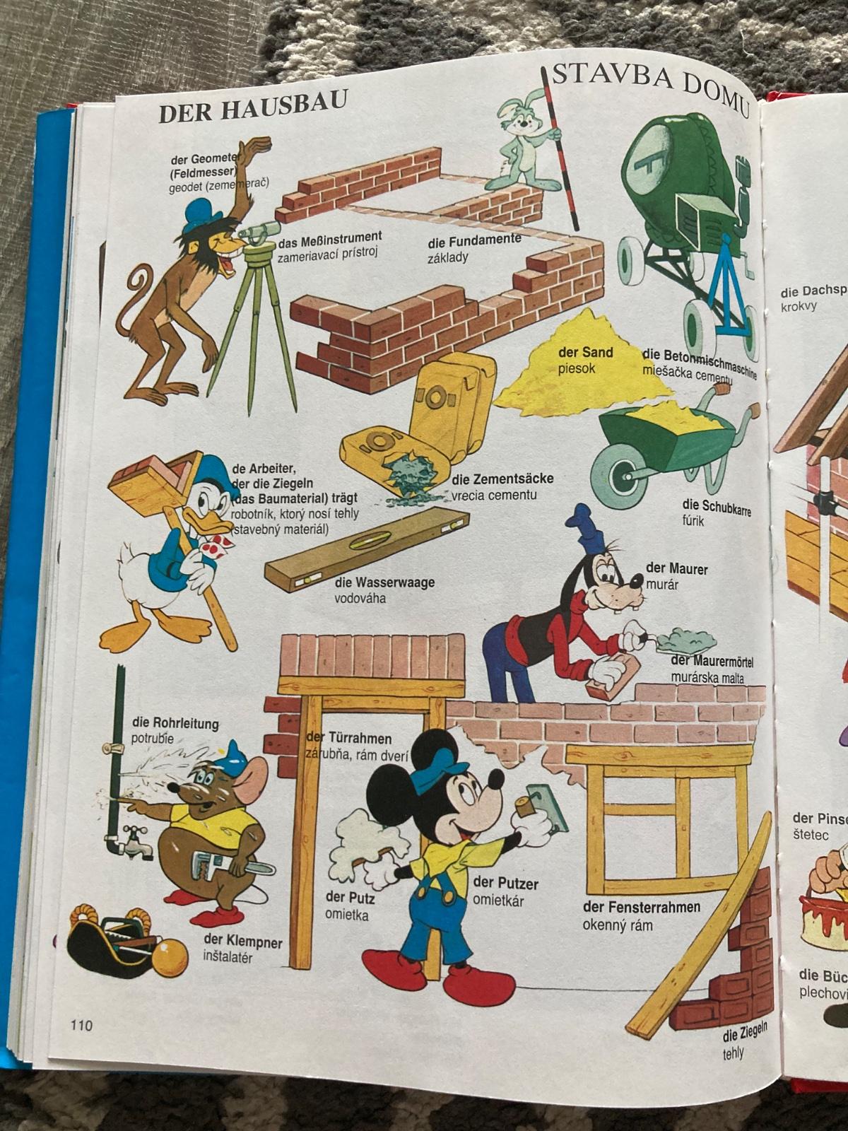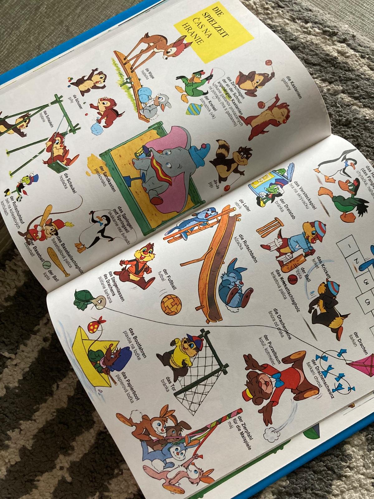 🔹Slovník obsahuje témy z každodenného života (napr. Ráno, Na ulici, Na pošte) doplnené o ilustrácie klasických postavičiek od Disneyho. Slovíčka sú uvedené v nemčine (často aj s členmi der, die, das) a slovenskom preklade.