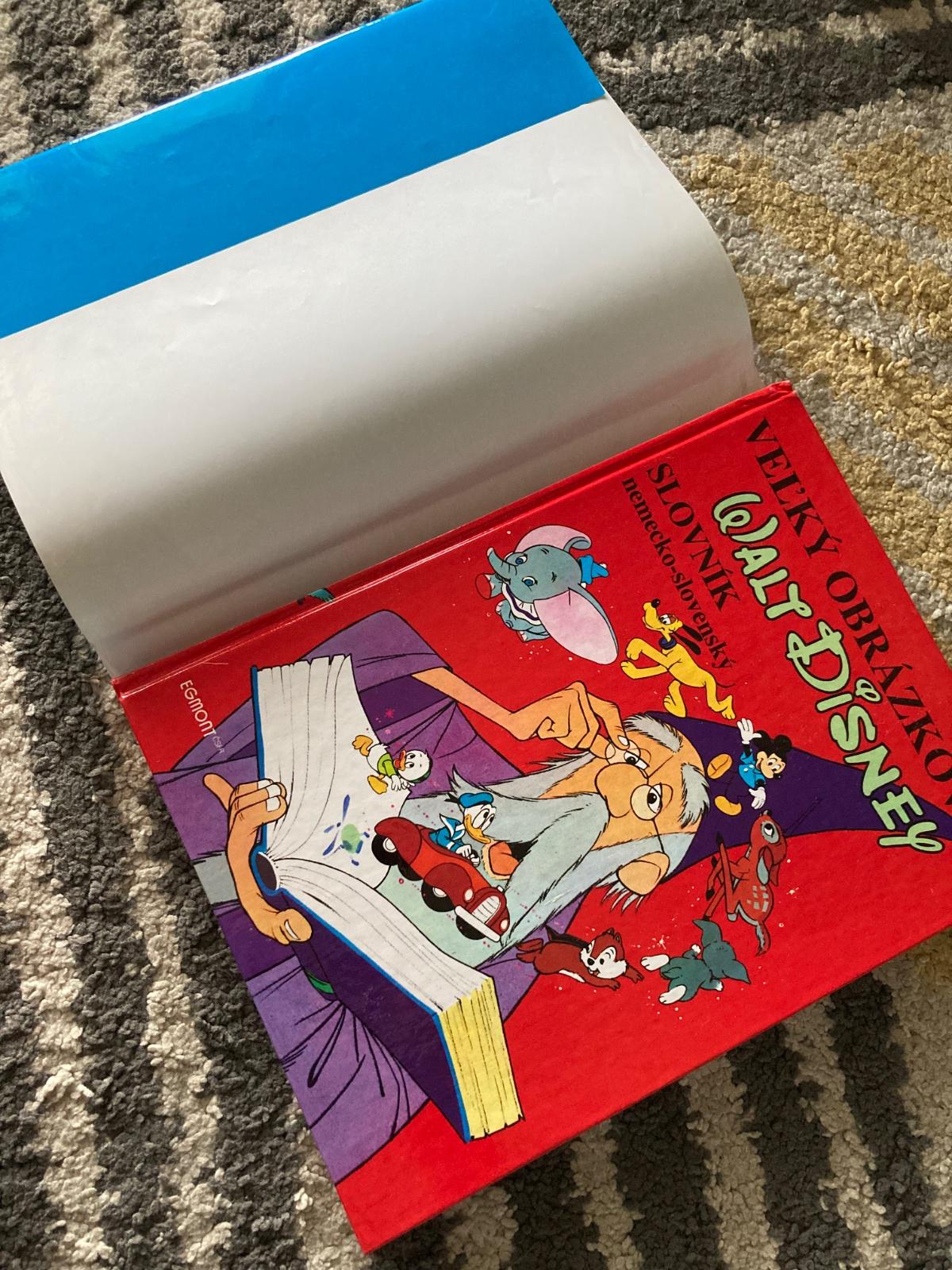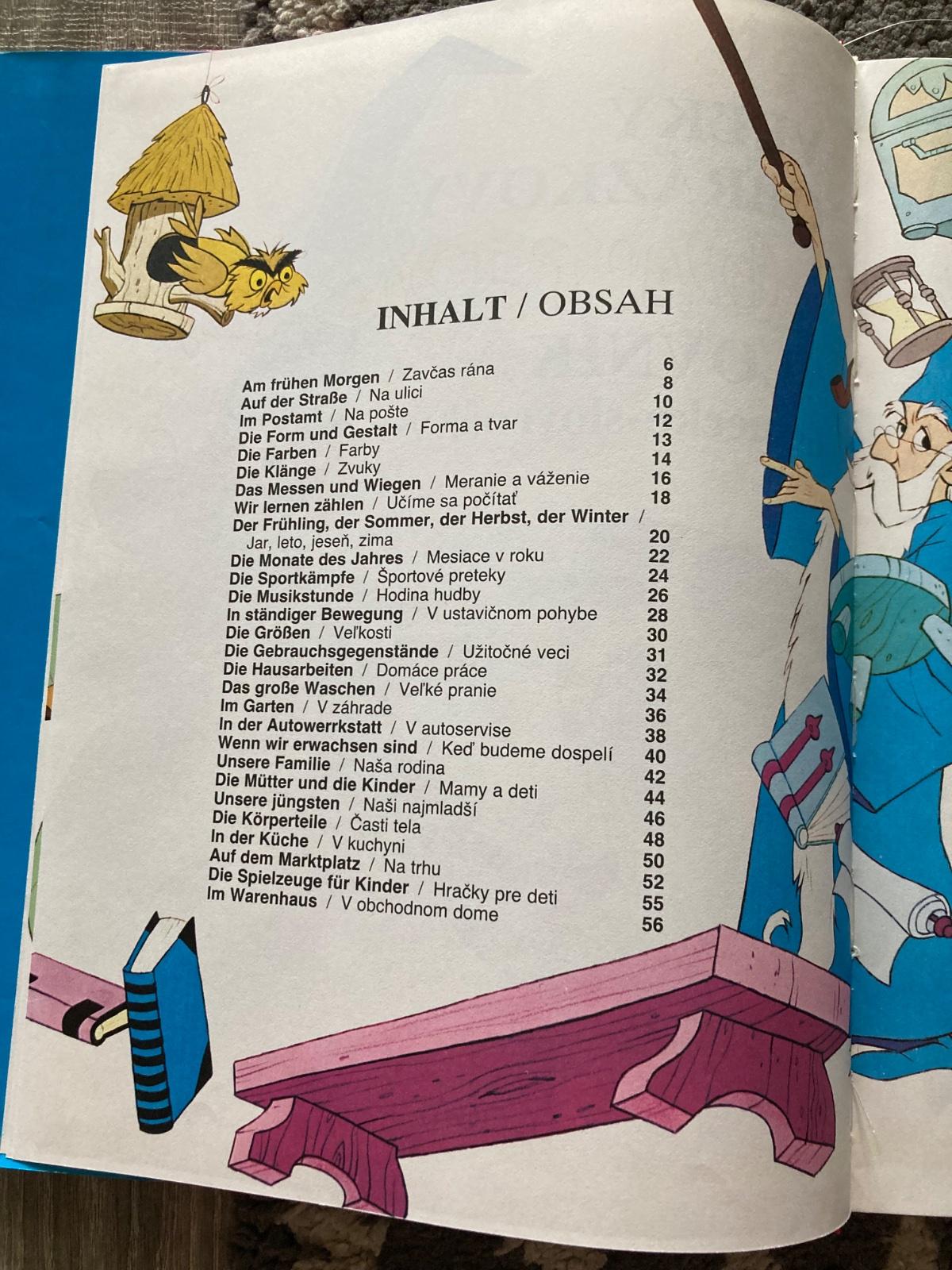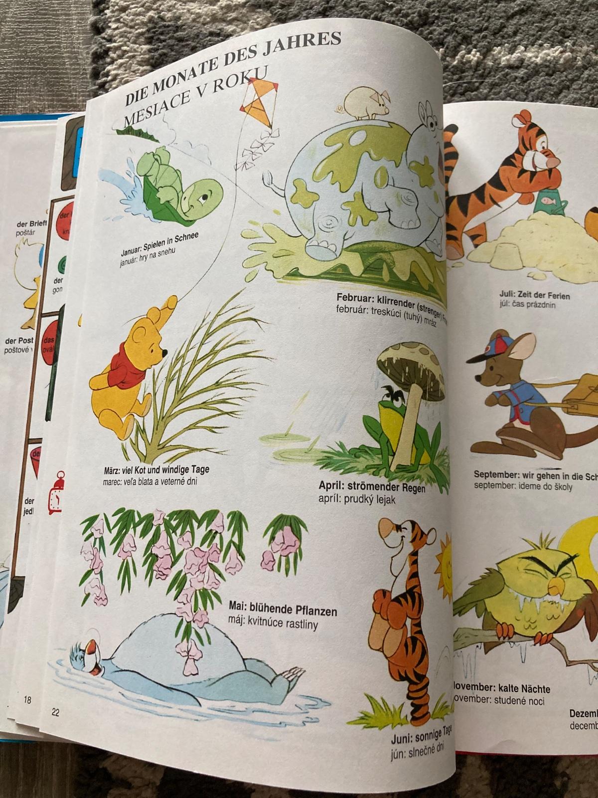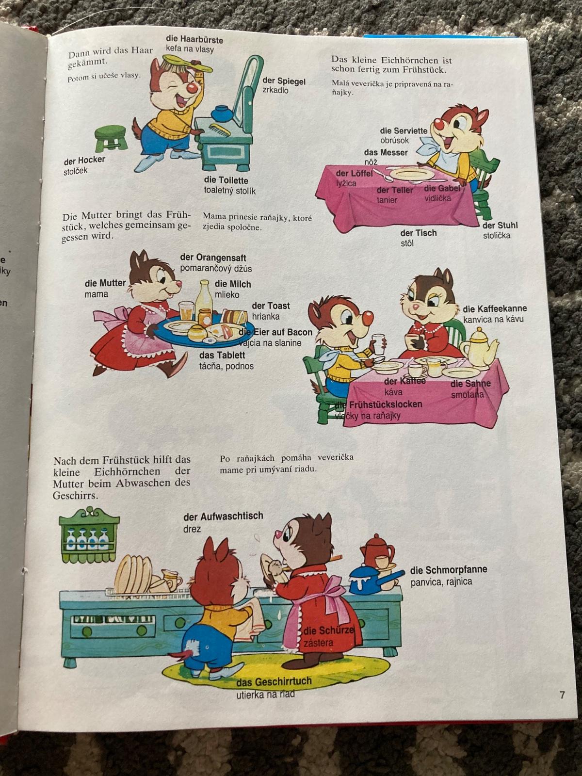 🔹Slovník obsahuje témy z každodenného života (napr. Ráno, Na ulici, Na pošte) doplnené o ilustrácie klasických postavičiek od Disneyho. Slovíčka sú uvedené v nemčine (často aj s členmi der, die, das) a slovenskom preklade.
