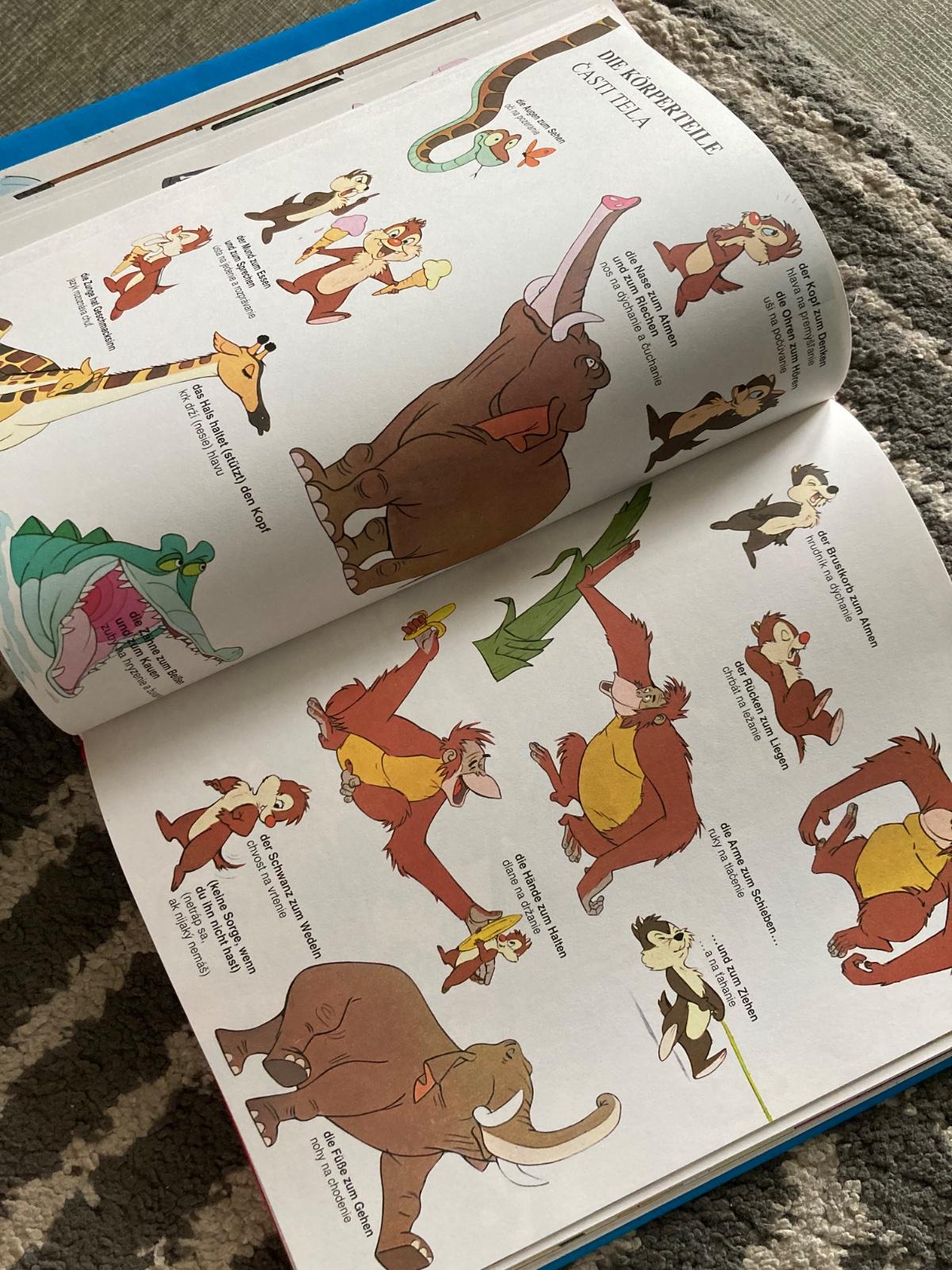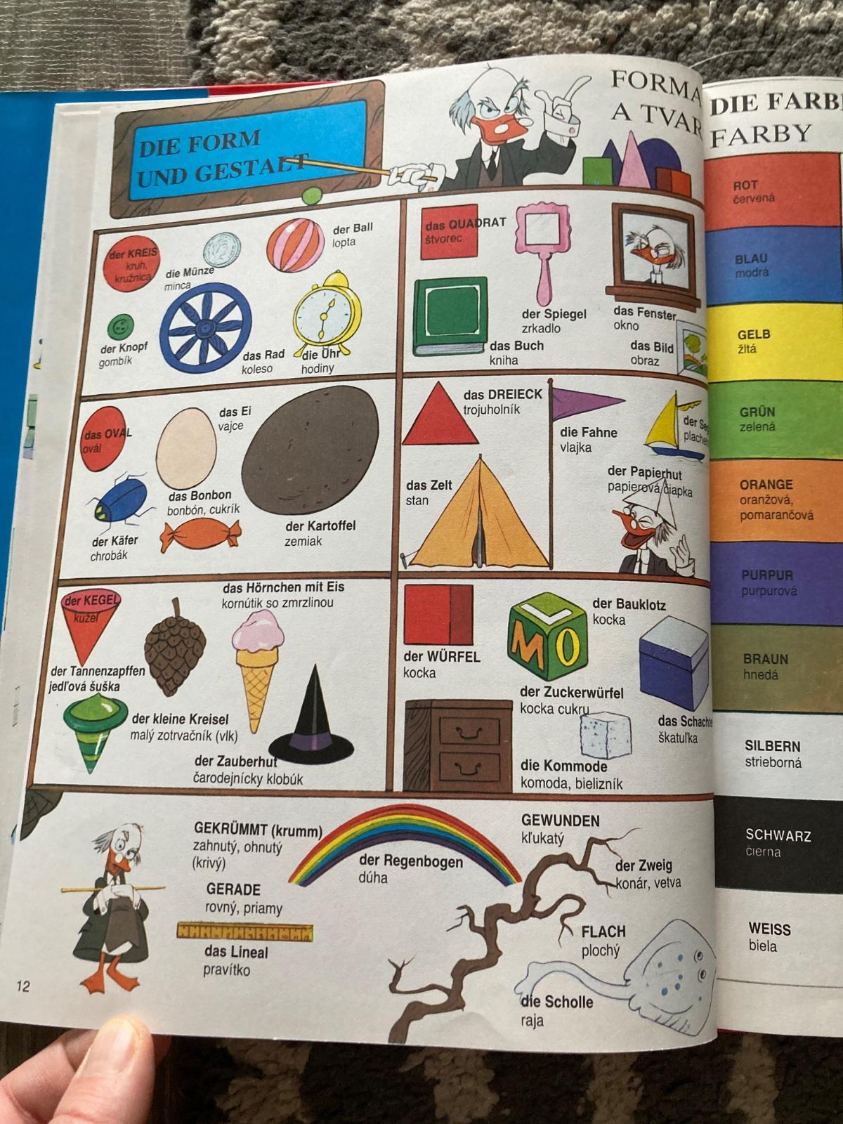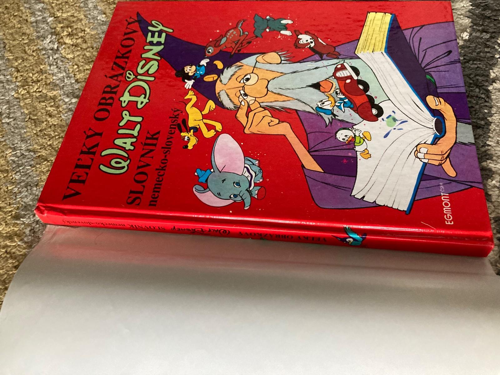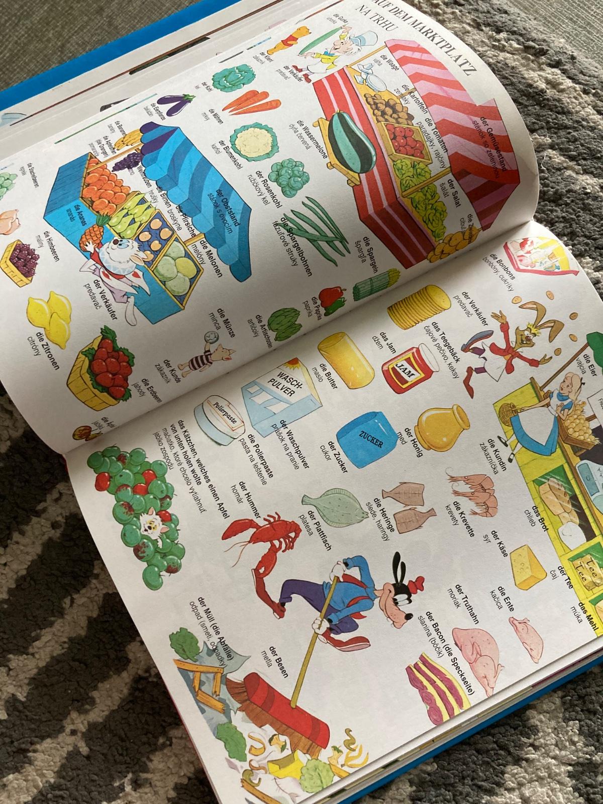 🔹Slovník obsahuje témy z každodenného života (napr. Ráno, Na ulici, Na pošte) doplnené o ilustrácie klasických postavičiek od Disneyho. Slovíčka sú uvedené v nemčine (často aj s členmi der, die, das) a slovenskom preklade.