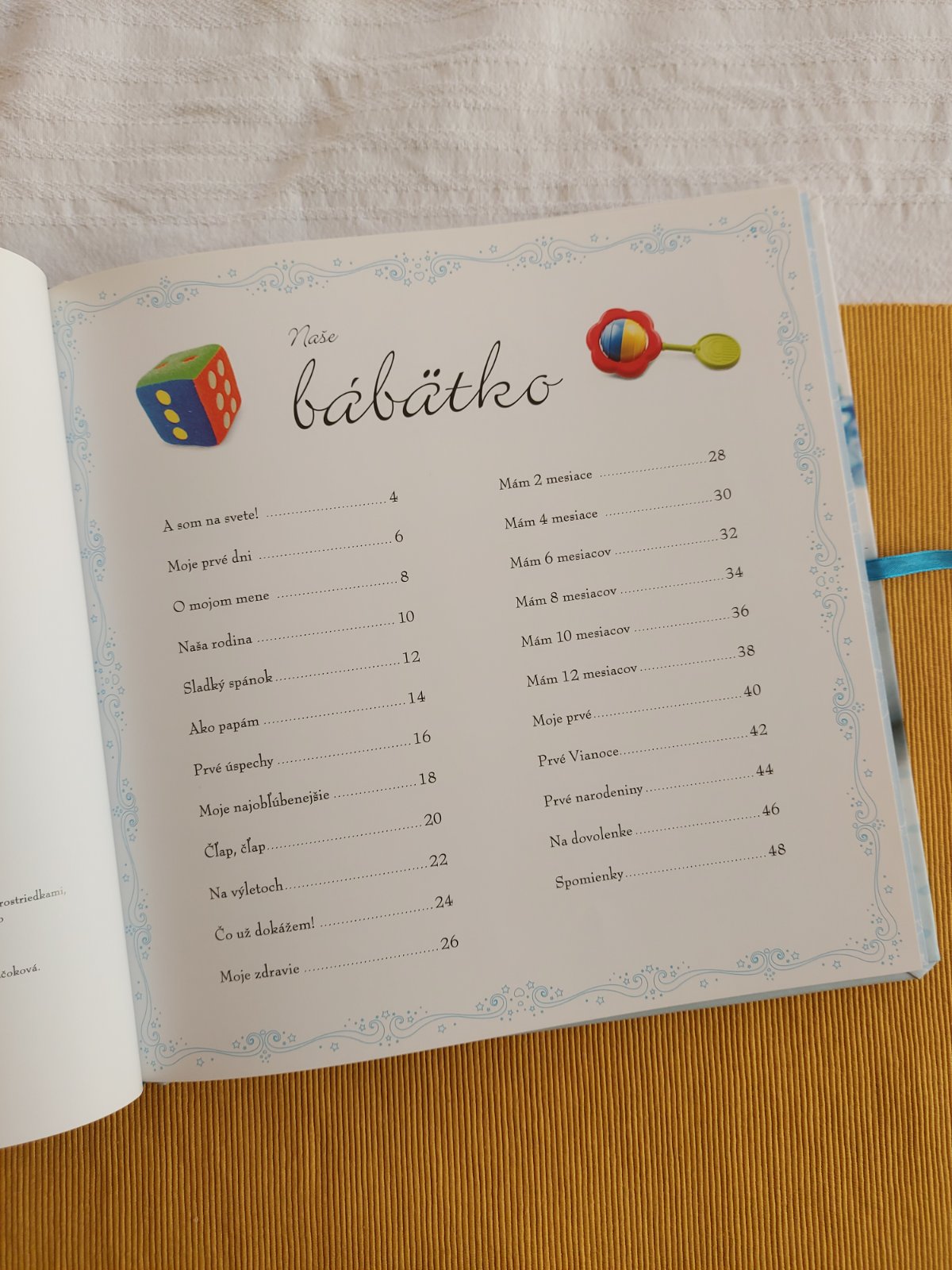 Milá knižka-pamätníček venovaná spomienkam na dieťatko od narodenia po prvý rok života. Zápisky o narodení dieťaťa, jeho zvyklostiach a prvých úspechoch, dôležitých pokrokoch vo vývoji či špeciálnych príležitostiach s blízkymi ľuďmi. Súčasťou knihy sú tradičné detské riekanky a pesničky a tiež priestor na fotografie bábätka. Je to jedinečný spôsob, ako si uchovať spomienky na toto očarujúce obdobie.