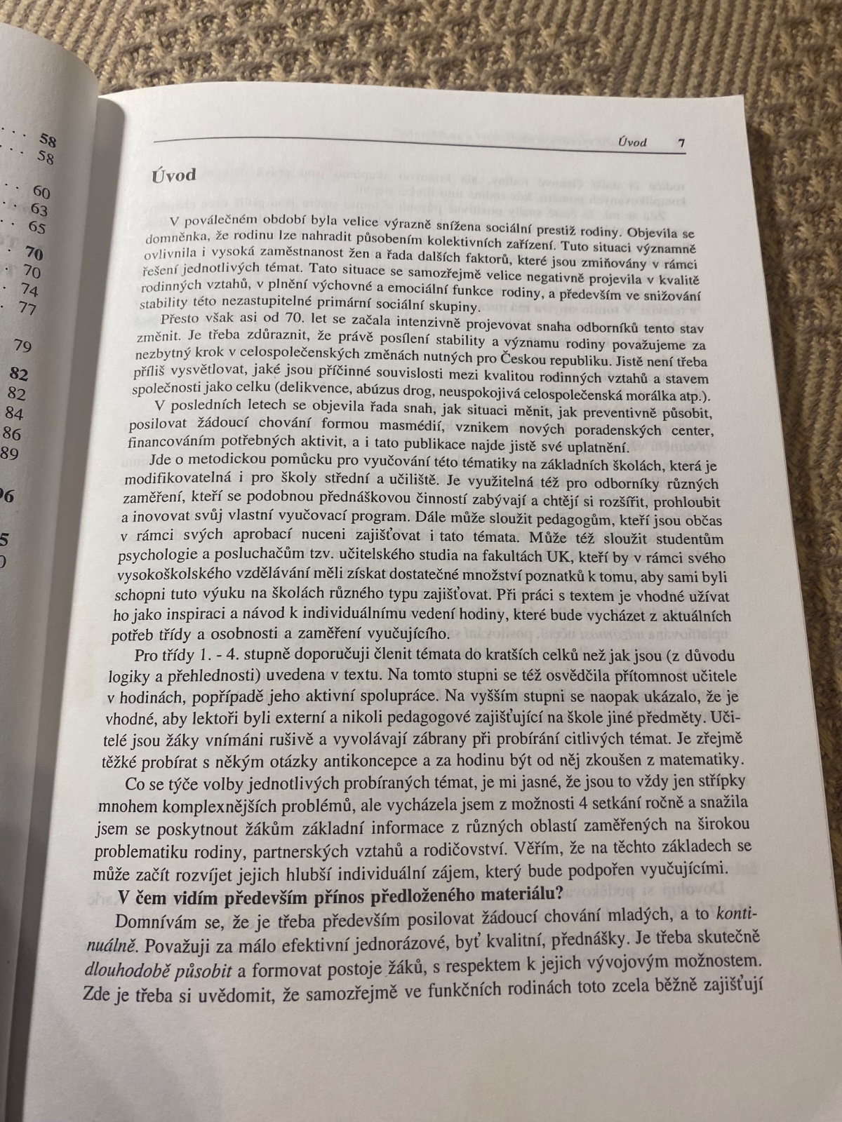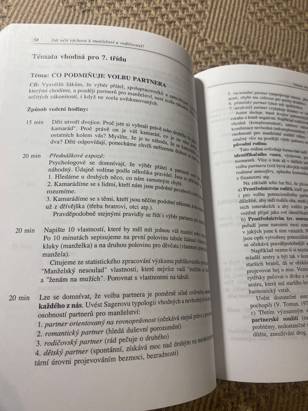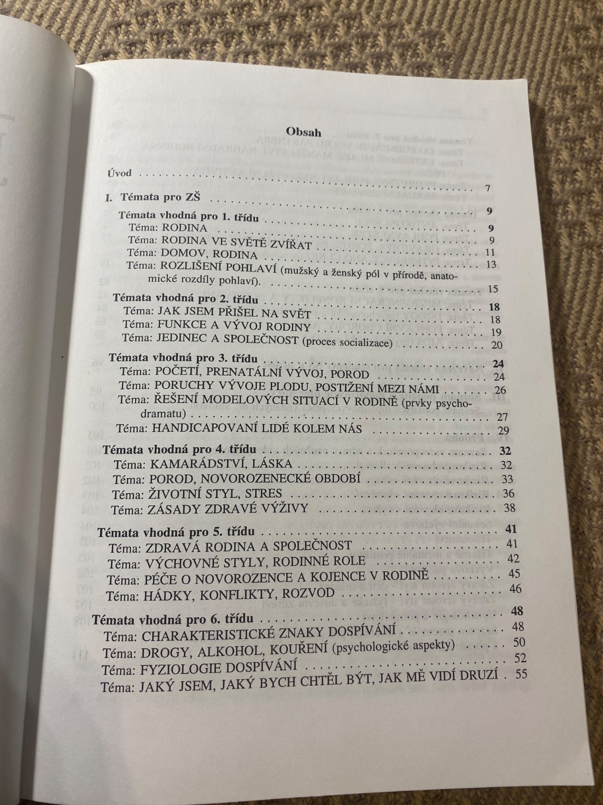 Autorka svou knížkou pomáhá vyučujícím, kteří stojí před problémem učit sexuální výchovu k manželství a rodičovství na školách. V knize zpracovává řadu témat široce zaměřených na rodinu, partnerské vztahy, vývoj člověka a jeho zařazení do společnosti, na vztahy mezi vrstevníky, problematiku handicapovaných dětí ve skupině, na otázky abúzu drog, AIDS, pohlavních chorob atd. Autorka volila témata a přístup adekvátně věku posluchačů (tedy 6 – 15 let). Lze je ale přizpůsobit i pro výuku na středních školách a učilištích. Vedle samotných odborných informací kniha poskytuje cenné metodické návody, jak témata učit. Autorka využila především principu vlastního prožitku, zkušeností a názornosti, a zdůraznila dlouhodobost a komplexnost výchovy. Publikaci doplňuje seznam odborných videopomůcek i bohatý seznam literatury.