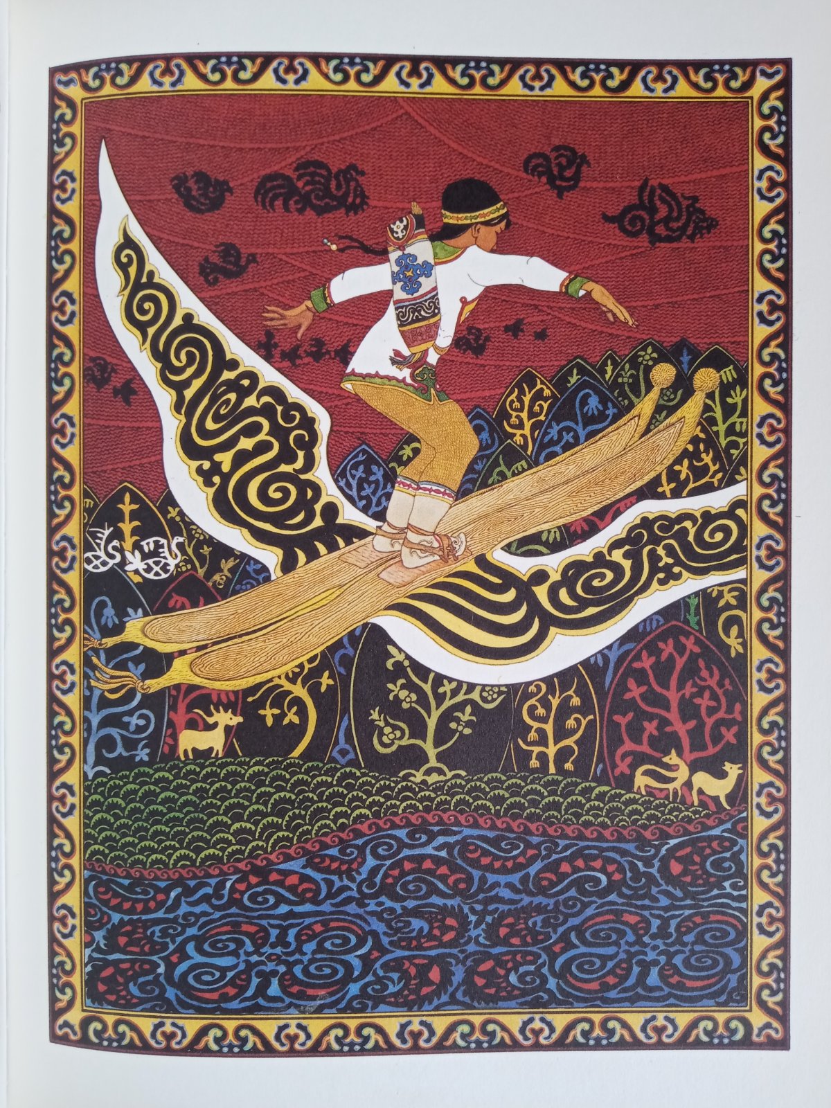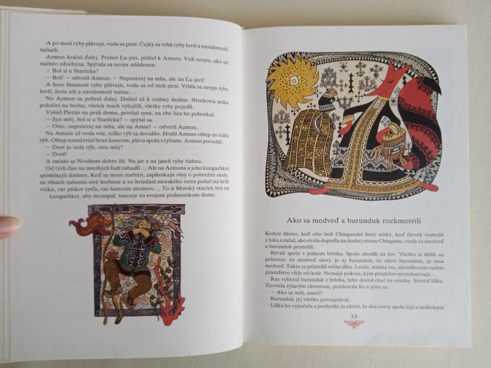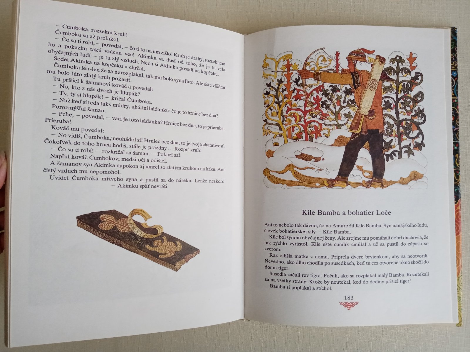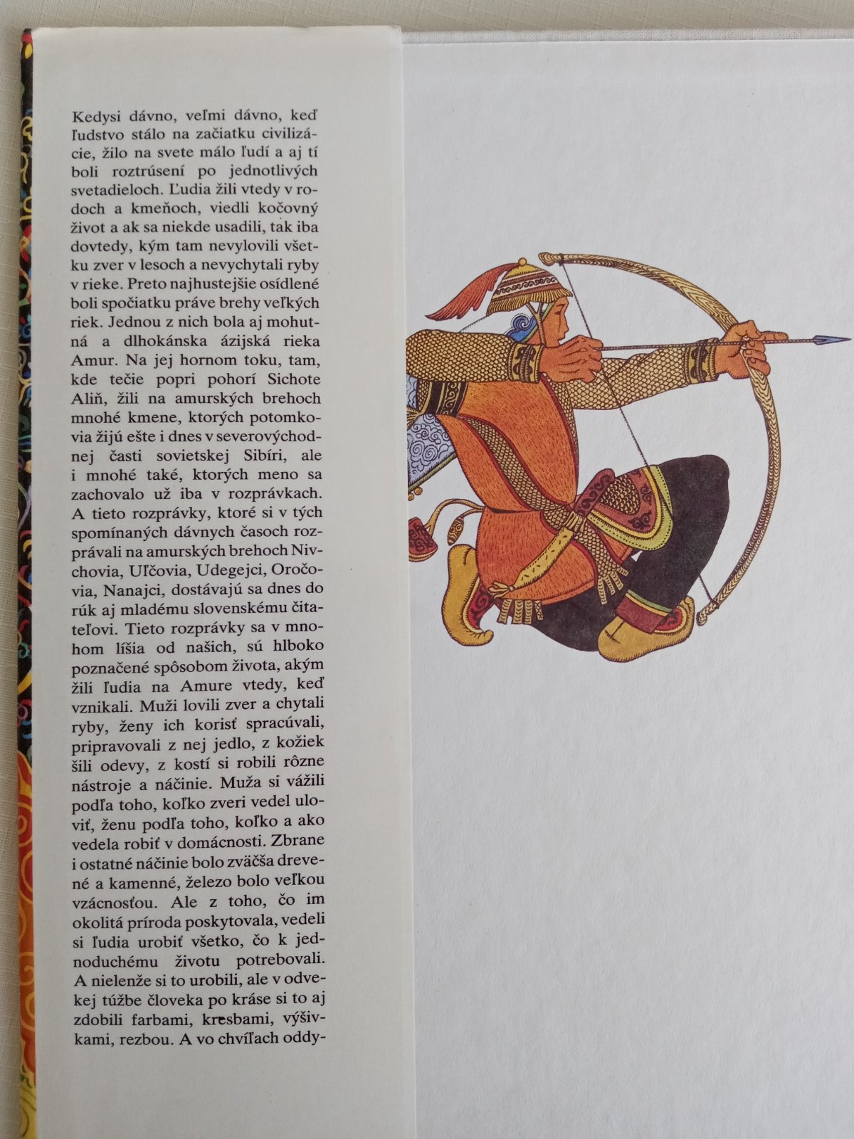 Rozprávky národov ďalekého východu, žijúcich pri rieke Amur, verne zrkadlia tvrdý život lovcov a ich bezprostredný vzťah k prírode. Hrdinovia rozprávok sú statoční ľudia s čistými srdciami, ktorí sa pre dobro druhých i vlastné šťastie bijú s obludami a zlými kúzelníkmi, podstupujú ťažké životné skúšky a víťazia v nich svojou neohrozenosťou, múdrosťou, húževnatosťou a vernosťou. Ľudová múdrosť národov lovcov je krásne vyjadrená v rozprávkach o zvieratách a zlých ľuďoch, ktorí sa za trest premenenia na zviera, aj v rozprávkach o zlých boháčoch, ktorí nakoniec vždy prehrajú. Ilustrácie Gennadija Pavlišina svojim čarom, pestrosťou a bohatosťou v ničom nezaostávajú za textom. Ich autor bol v roku 1977 na BIB odmenený cenou Zlaté jablko.
