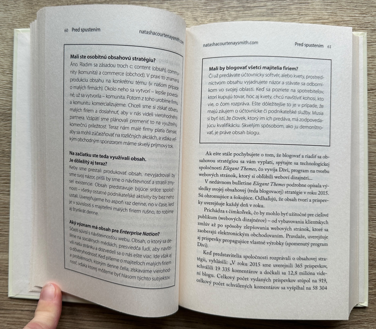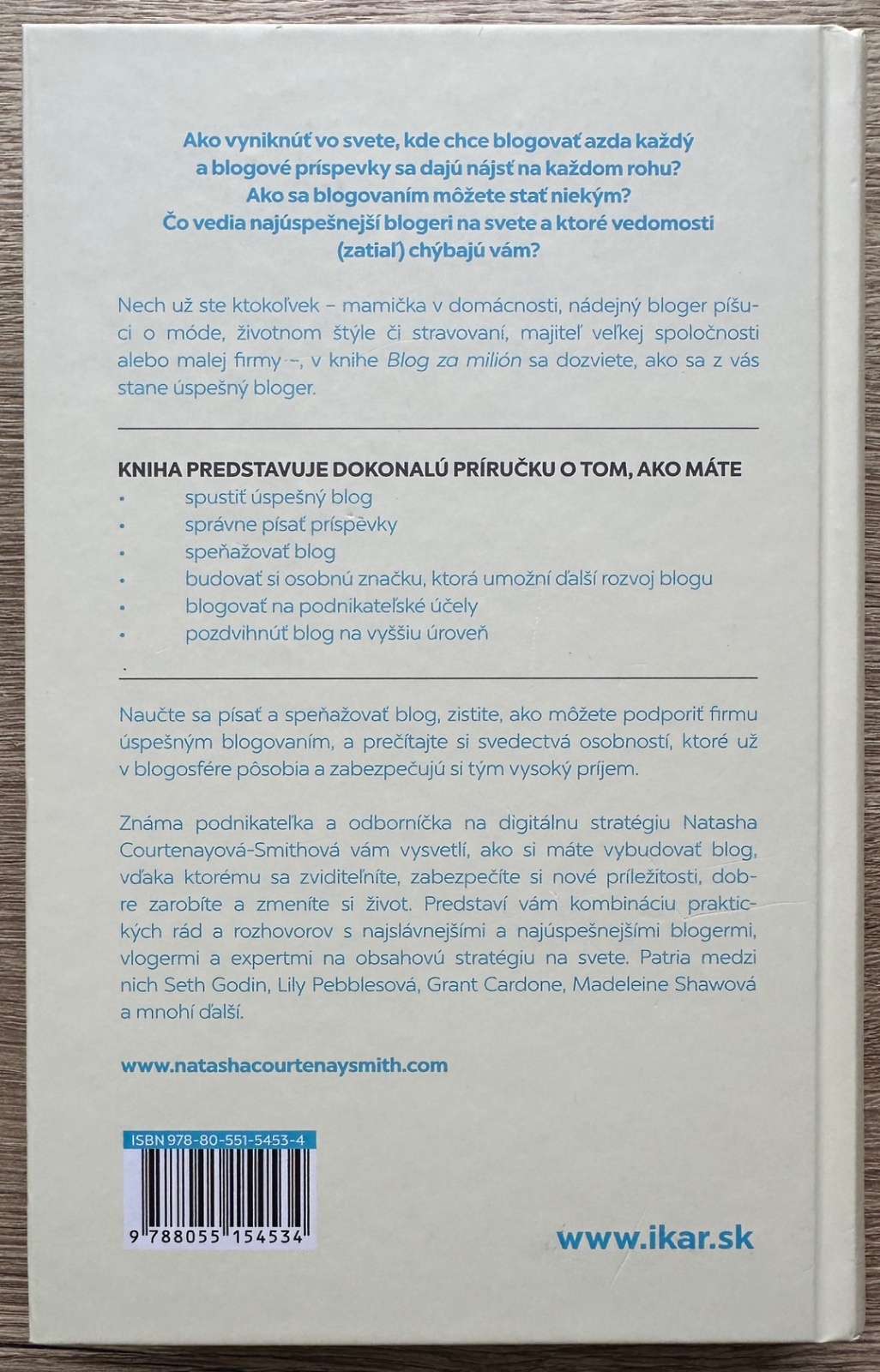 ☘️❤️Kniha je citana ale ako nova.Ako vyniknúť vo svete, kde chce blogovať azda každý a blogové príspevky sa dajú nájsť na každom rohu? Ako sa blogovaním môžete stať niekým? Čo vedia najúspešnejší blogeri na svete a ktoré vedomosti (zatiaľ) chýbajú vám? Nech už ste ktokoľvek – mamička v domácnosti, nádejný bloger píšuci o móde, životnom štýle či stravovaní, majiteľ veľkej spoločnosti alebo malej firmy –, v knihe Blog za milión sa dozviete, ako sa z vás stane úspešný bloger. Kniha predstavuje dokonalú príručku o tom, ako máte • spustiť úspešný blog • správne písať príspevky • speňažovať blog • budovať si osobnú značku, ktorá umožní ďalší rozvoj blogu • blogovať na podnikateľské účely • pozdvihnúť blog na vyššiu úroveň Naučte sa písať a speňažovať blog, zistite, ako môžete podporiť firmu úspešným blogovaním, a prečítajte si svedectvá osobností, ktoré už v blogosfére pôsobia a zabezpečujú si tým vysoký príjem. Podnikateľka a odborníčka na digitálnu stratégiu Natasha Courtenayová-Smithová vám vysvetlí, ako si máte vybudovať blog, vďaka ktorému sa zviditeľníte, zabezpečíte si nové príležitosti, dobre zarobíte a zmeníte si život. Predstaví vám kombináciu praktických rád a rozhovorov s najslávnejšími a najúspešnejšími blogermi, vlogermi a expertmi na obsahovú stratégiu na svete. Patria medzi nich Seth Godin, Lily Pebblesová, Grant Cardone, Madeleine Shawová a mnohí ďalší. Väzba: pevná s přebalem,Vydavateľ:Ikar,Počet strán:304,jazyk:slovensky☘️❤️