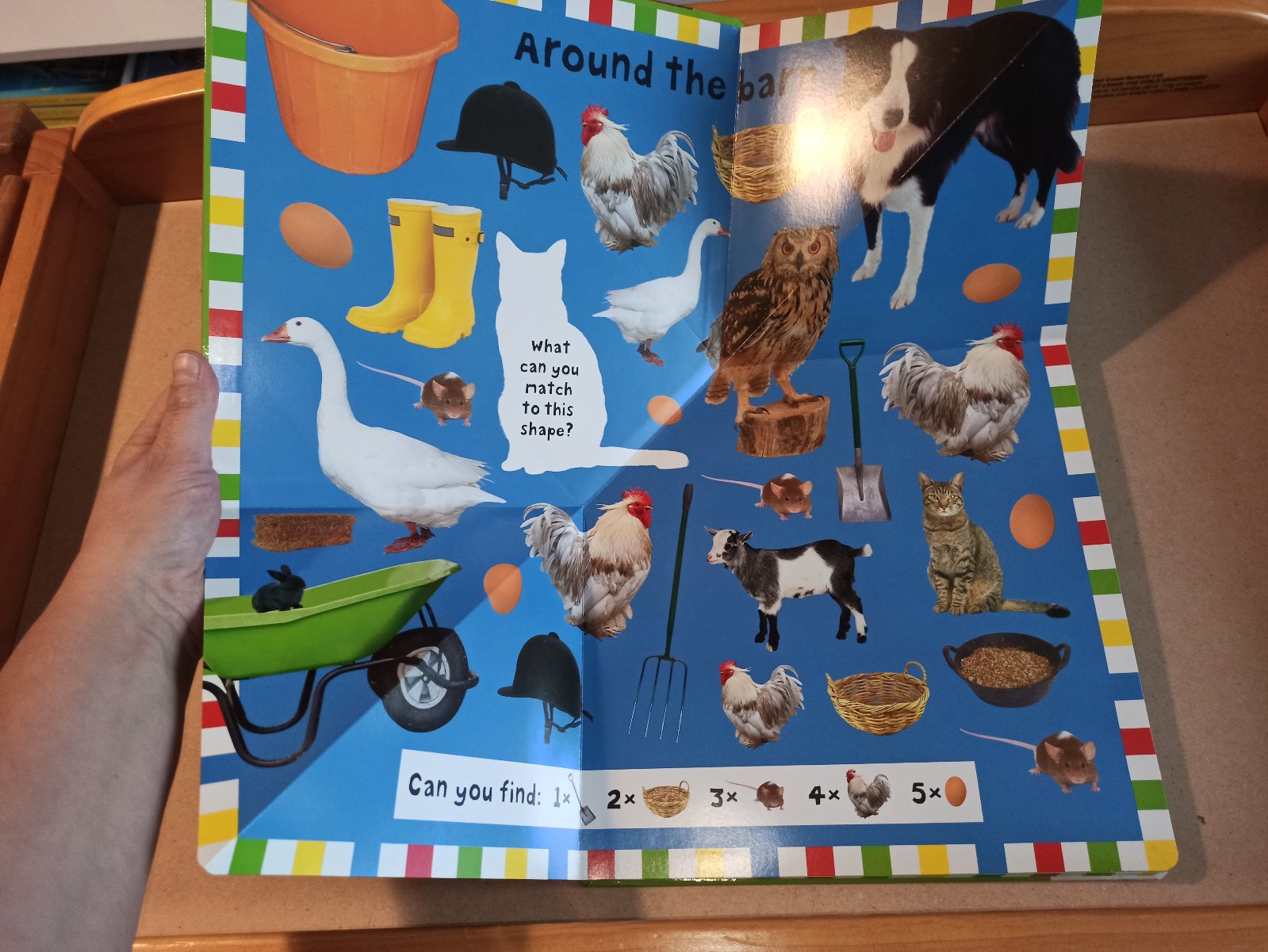 V knihe je pat velikych dvojstranok, treba hladat predmety alebo len tak, pozerat obrazky.