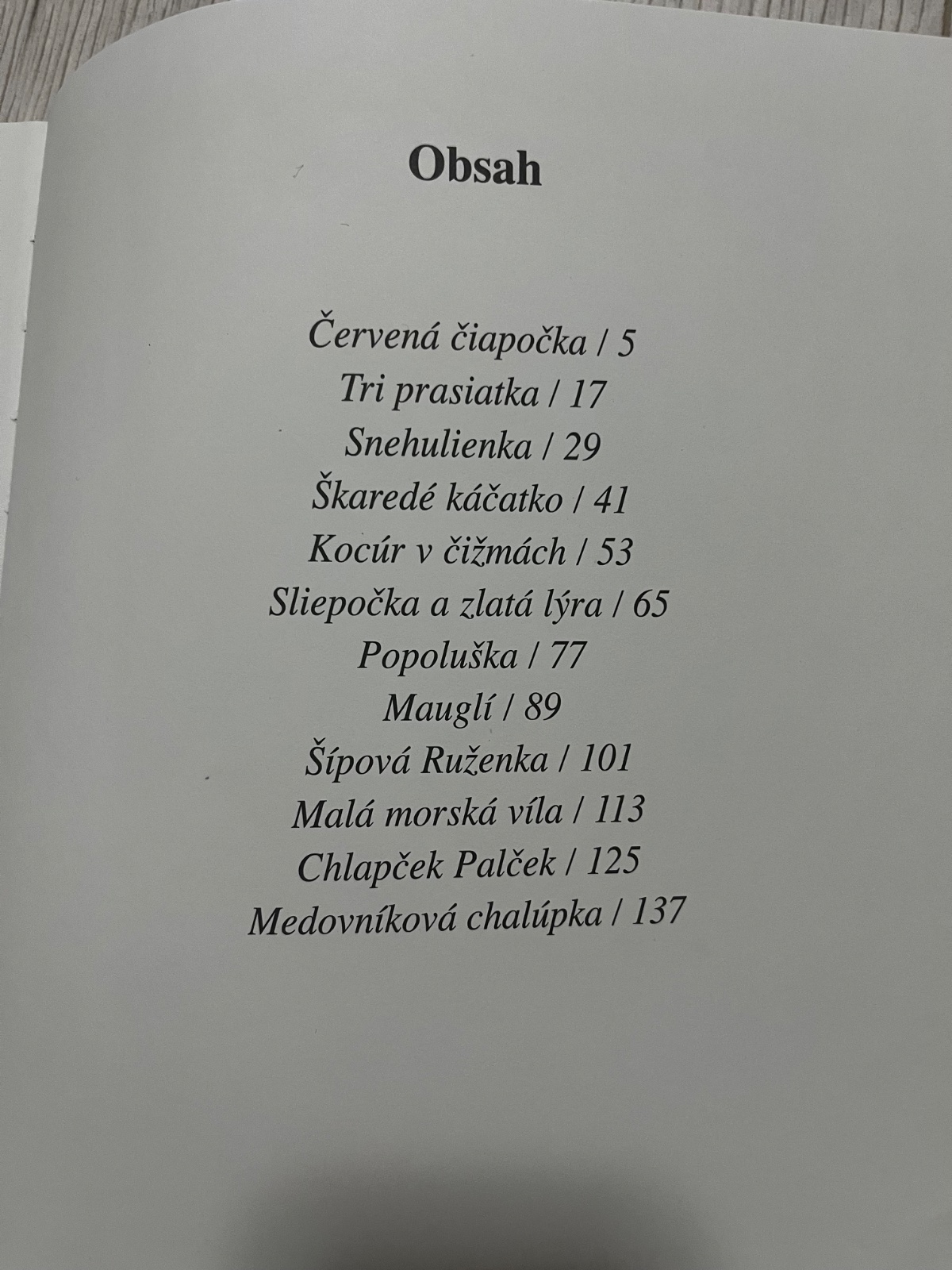 tejto knihe nájdete zmes tých najkrajších a najznámejších rozprávok. Rozprávky ako Červená čiapočka, Tri prasiatka, Snehulienka, Škaredé káčatko, Kocúr v čižmách a mnohé ďalšie. Kniha je písaná veľkým písmom, takže ju ľahko prečíta aj malý školák. Každá rozprávka je doplnená veselou ilustráciou.