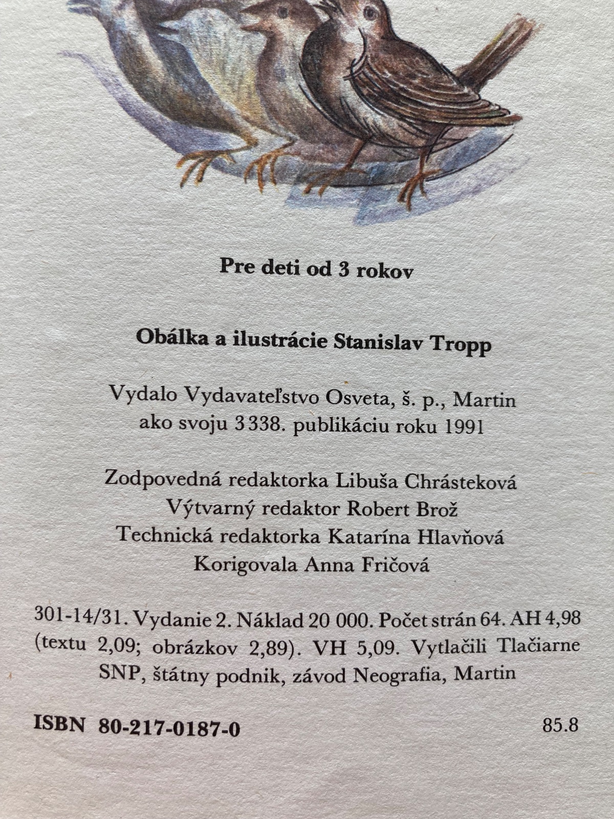 veľmi pekný stav, krásna a zachovalá knižka, vydanie z roku 1991, s krásnymi ilustráciami, bez pečiatok, vpredu má krátke venovanie inak je bez vpisov, pekné listy, dvojstránka vzadu zalepená páskou, obal pekný