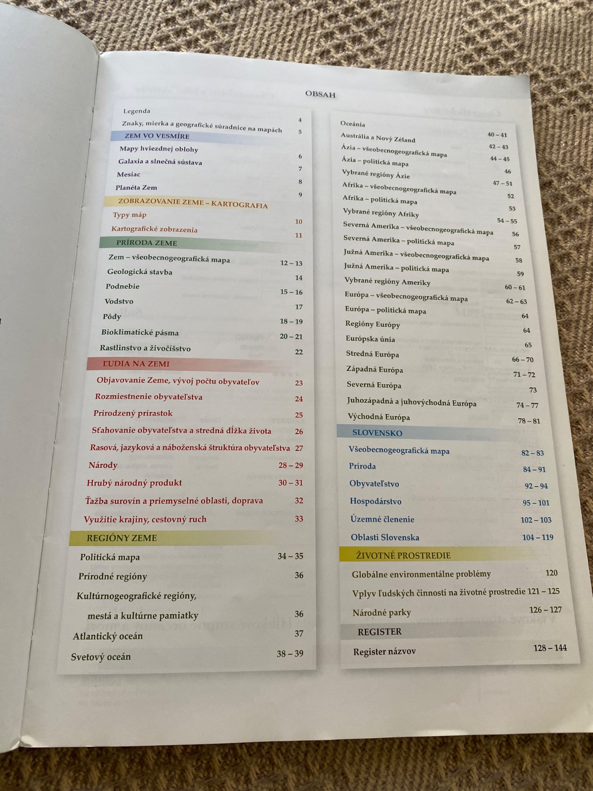 Geografický atlas pre základné a stredné školy - vhodný aj pre celú rodinu. - ucelený pohľad na svetadiely a ich krajiny - informácie v tabuľkách a grafoch - register geografických názvov