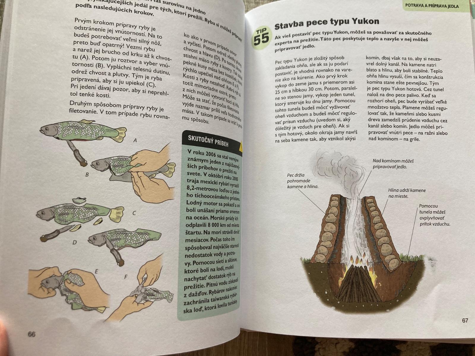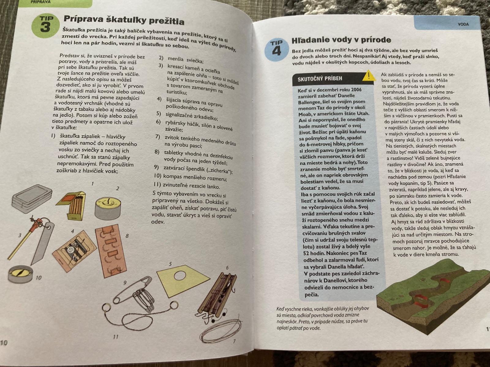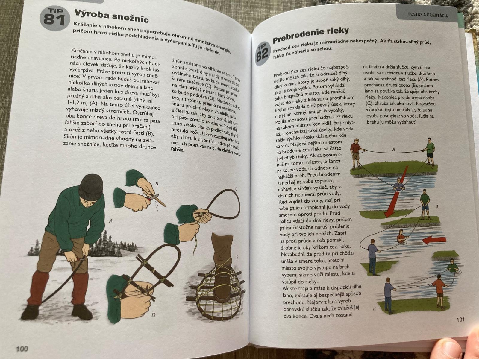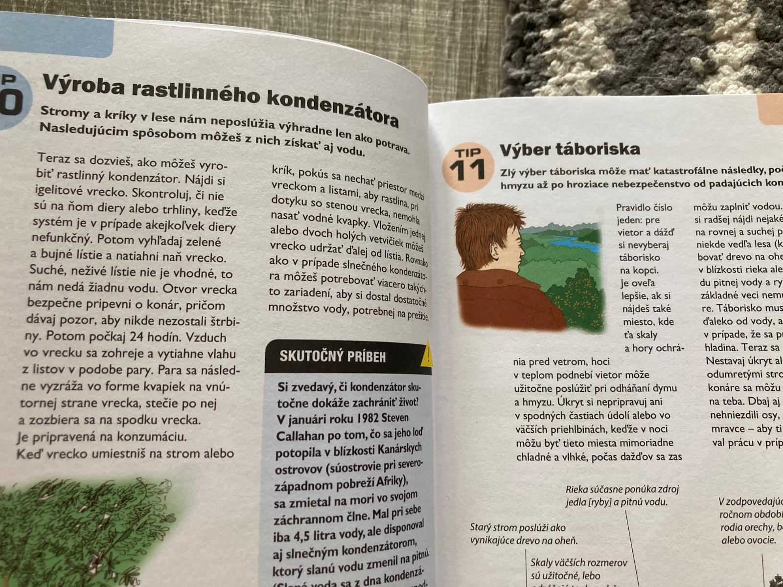 📌Táto príručka je ľahko dostupný, ilustrovaný návod na prežitie v prírode. Okrem iného predstavuje techniky ako hľadanie vody, príprava úkrytu, zakladanie ohňa, zhotovenie nástrojov, stavanie pascí, lov, určenie jedlých rastlín, varenie v prírode, výroba oblečenia na prežitie, orientácia v prírode, ošetrenie rán, bodnutí a štípancov a vysielnanie núdzových signálov. Kniha obsahuje skutočné príbehy o ľuďoch, ktorí sa dostali do ťažkostí a ktorí vďaka svojej zručnosti a niektorým technikám prezentovaným v tejto knihe prežili v prírode.