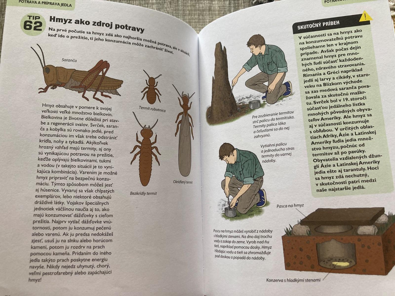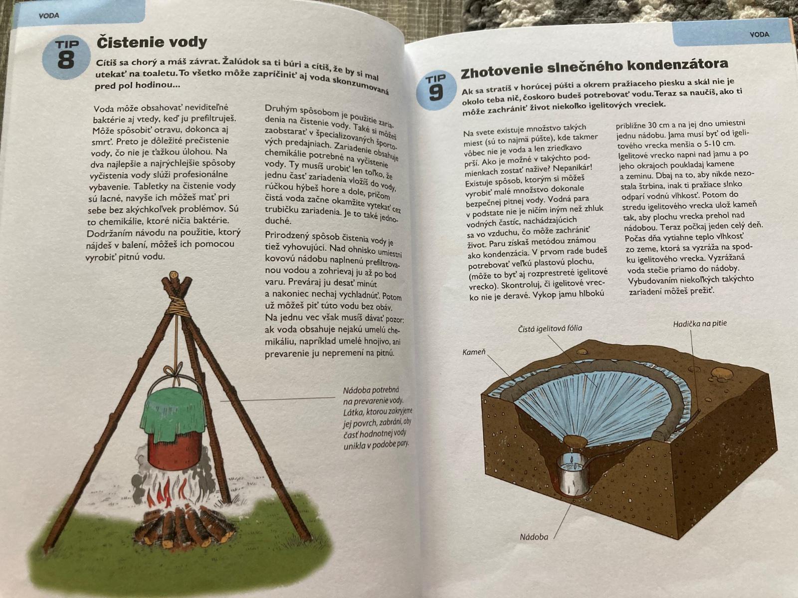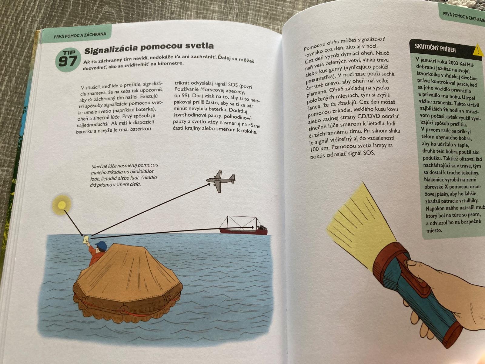 📌Táto príručka je ľahko dostupný, ilustrovaný návod na prežitie v prírode. Okrem iného predstavuje techniky ako hľadanie vody, príprava úkrytu, zakladanie ohňa, zhotovenie nástrojov, stavanie pascí, lov, určenie jedlých rastlín, varenie v prírode, výroba oblečenia na prežitie, orientácia v prírode, ošetrenie rán, bodnutí a štípancov a vysielnanie núdzových signálov. Kniha obsahuje skutočné príbehy o ľuďoch, ktorí sa dostali do ťažkostí a ktorí vďaka svojej zručnosti a niektorým technikám prezentovaným v tejto knihe prežili v prírode.