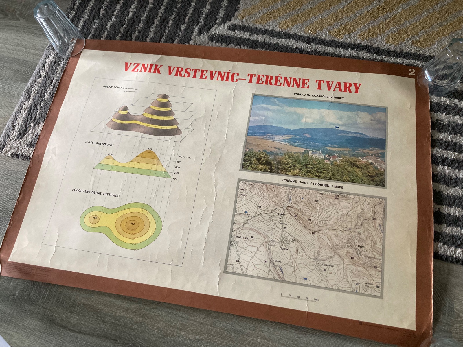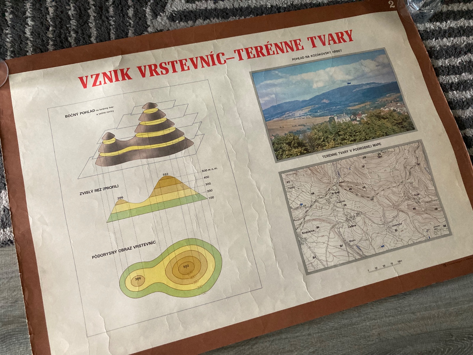 pekný stav, staršia nástenná učebná pomôcka - Vznik vrstevníc- terénne tvary, základy kartografie