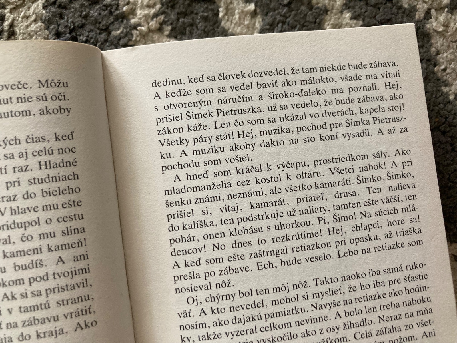 Tento román je v podstatě jediný dramatický monolog. V myšlenkách Šimka, hlavního hrdiny románu se prolínají vzpomínky autora na vlastní dětství a mládí s dramatickými osudy lidí, které znal. Líčí svůj život v rodné vesnici s výjimkou války, kdy bojoval u partyzánů a dvě léta, která strávil v nemocnici po úraze.