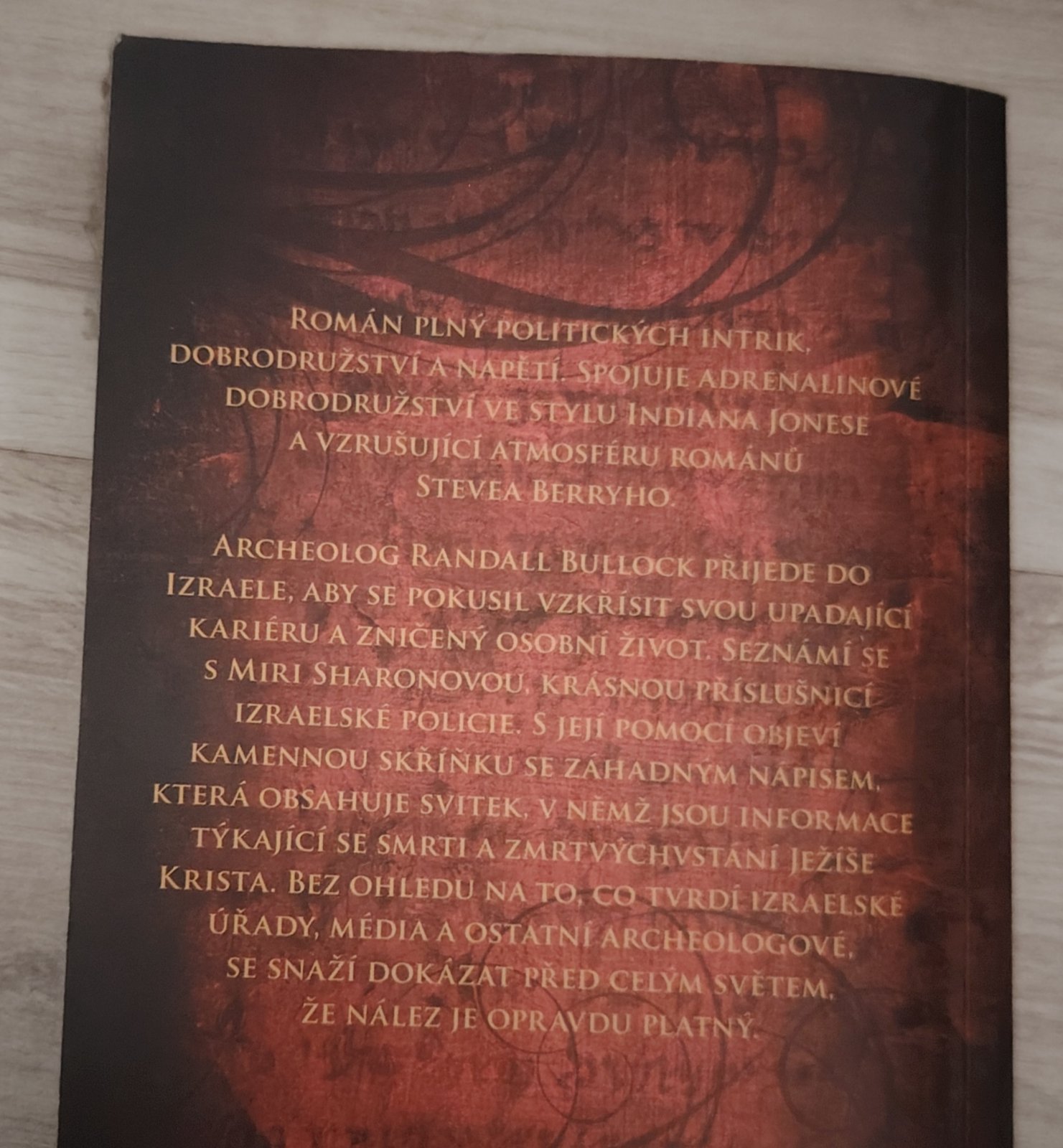 Román plný politických intríg, dobrodružstiev a napätia. Spája adrenalínové dovbrodružstvo v štýle Indiana Jonesa a vzrušujúcu atmosféru románov Stevea Berryho. Archeológ Randall Bullock príde do Izraela, aby sa pokúsil vzkriesiť svoju upadajúcu kariéru a zničený osobný život. Zoznámia s es Miri Sharonovou, krásnou príslušníčkou izraelskej polície. S ho pomocou objaví tajomnú skrinku so záhadným nápisom, ktorá obsahuje zvitok, v ktorom sú informácie týkajúce sa smrti a zmŕtvychvstania Krista.