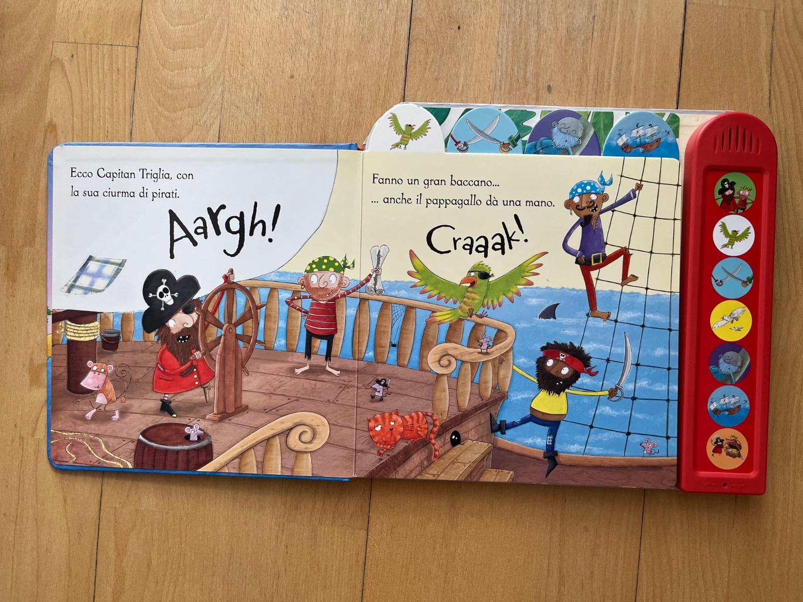 Zvuková knizka Piráti treba vymenit baterky, rozmer 30x28 cm, 10 vnútorných stran, kartón, 9 eur.