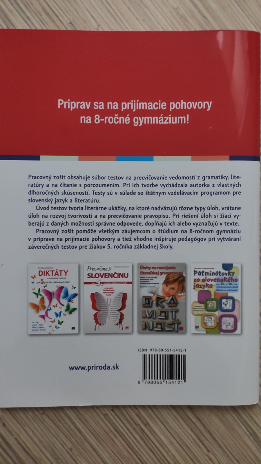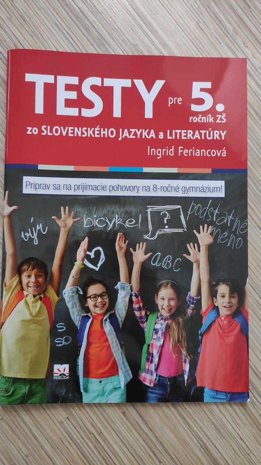Pracovný zošit, obsahujúci súbor testov na precvičenie vedomostí z gramatiky, literatúry a na čítanie s porozumením. Pri riešení si žiaci vyberajú z daných možností správne odpovede, dopĺňajú ich alebo vyznačujú v texte. Testy sú v súlade so štátnym vzdelávacím programom pre slovenský jazyk a literatúru. Sú vhodnou pomôckou na prípravu žiakov na osemročné gymnáziá.