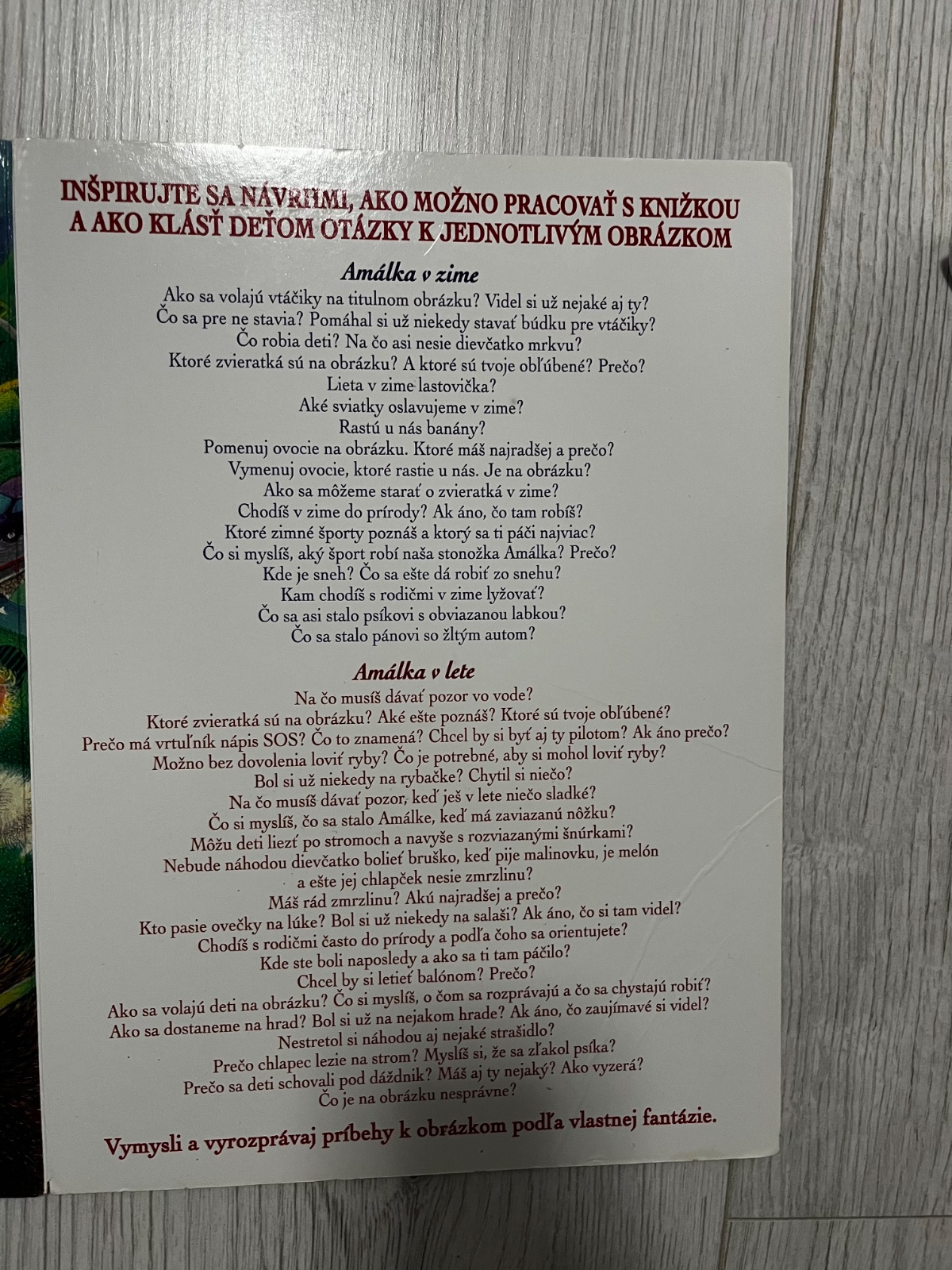 Predám nádherne ilustrovanú knižku o dobrodružnom putovaní stonožky Amálky v zimnej a letnej krajinke. Je takmer bez textu a je určená pre deti na rozvoj ich komunikatívnych schopností.