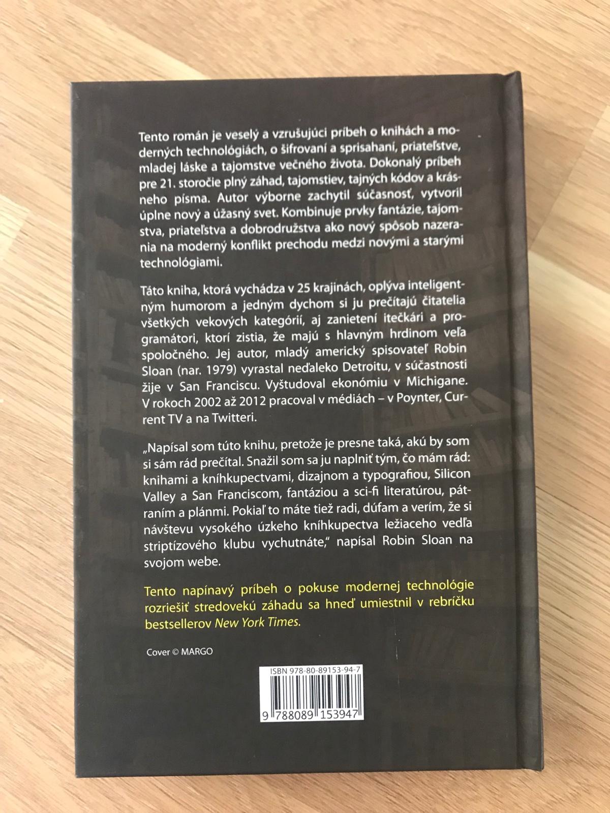 Veselý a vzrušujúci príbeh o knihách a moderných technológiách, o šifrovaní a sprisahaní, priateľstve, mladej láske a tajomstve večného života. Dokonalý príbeh pre 21. storočie, plný záhad, tajomstiev, tajných kódov a krásneho písma. Autor výborne zachytil súčasnosť, vytvoril úplné nový a úžasný svet. Kombinuje prvky fantázie, tajomstva, priateľstva a dobrodružstva ako nový spôsob nazerania na moderný konflikt prechodu medzi novými a starými technológiami.