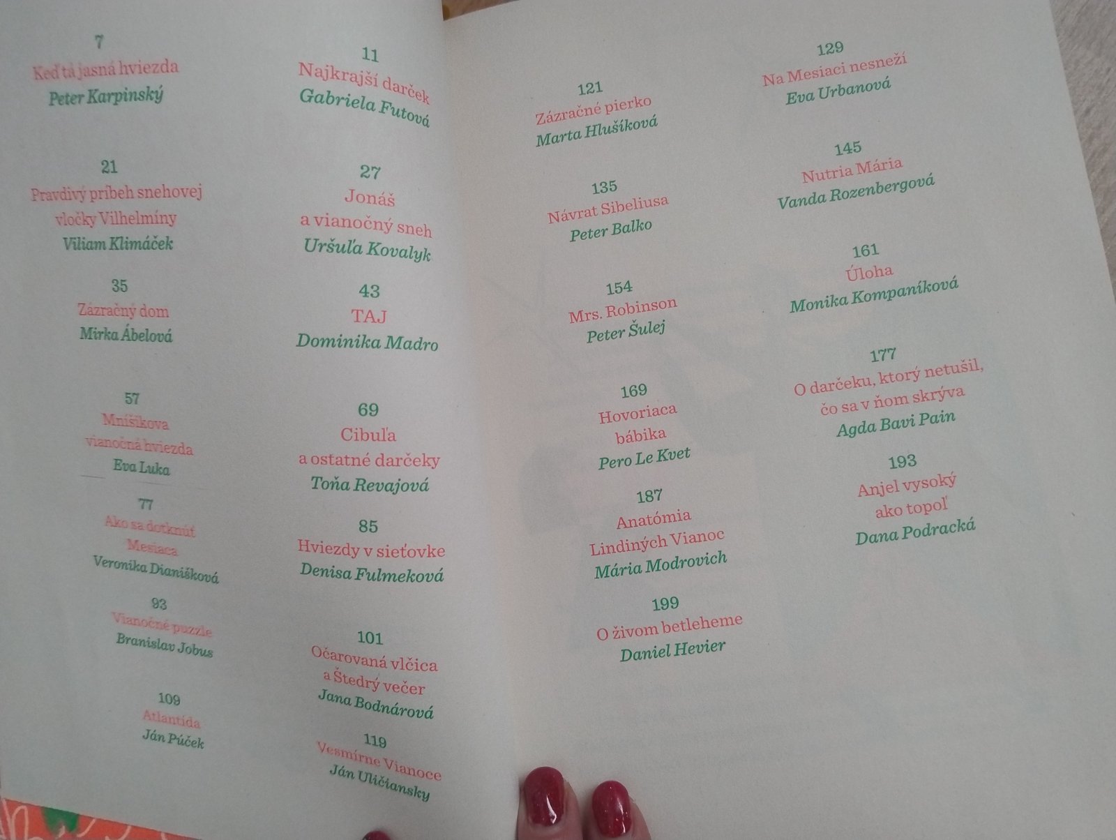 Svoj vianočný príbeh napísalo 25 slovenských autorov a autoriek. V knihe sa ukrýva mnoho prekvapení pre deti aj dospelých. Dozvieme sa z nej, kde býva Ježiško, aký darček je najlepším darčekom na svete, koľko existuje vesmírov, komu sa v očiach trblietajú súhvezdia, a veľa iného o tajomnej spolupatričnosti medzi ľuďmi a zvieratami.