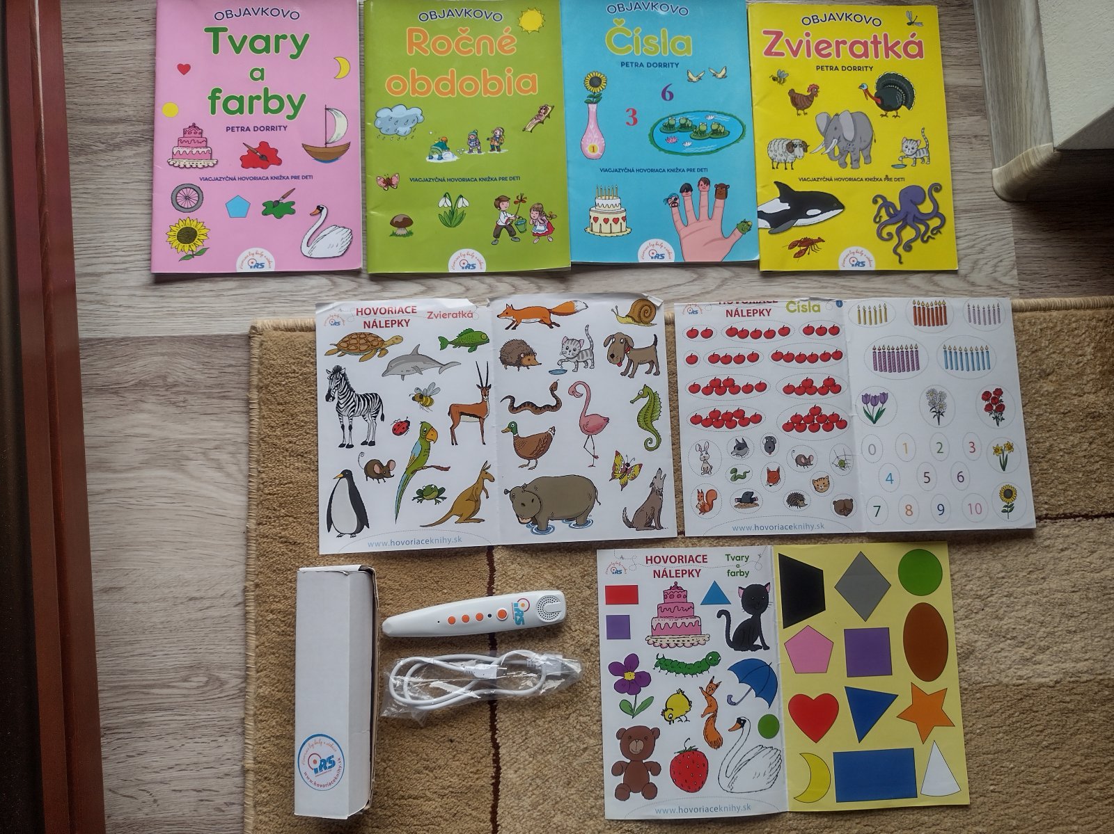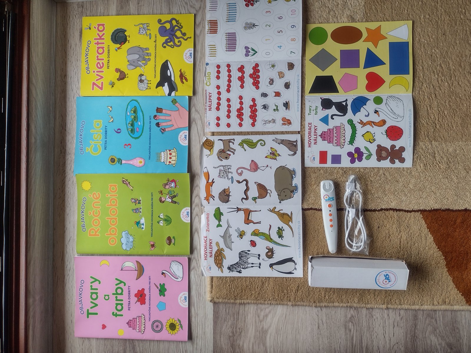 Spolu s interaktívnymi nálepkami. Hovoriace pero sa nabíja cez USB kábel.