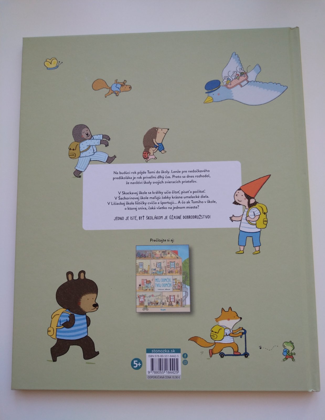 Detská náučná kniha Moja škola, Tvoja škola, príbeh sleduje malého zajaca Tomiho, ktorý sa už nevie dočkať nástupu do školy, a tak sa rozhodne navštíviť školy svojich zvieracích kamarátov. Kniha hravou formou ukazuje, že každá škola je iná a plná nových dobrodružstiev.