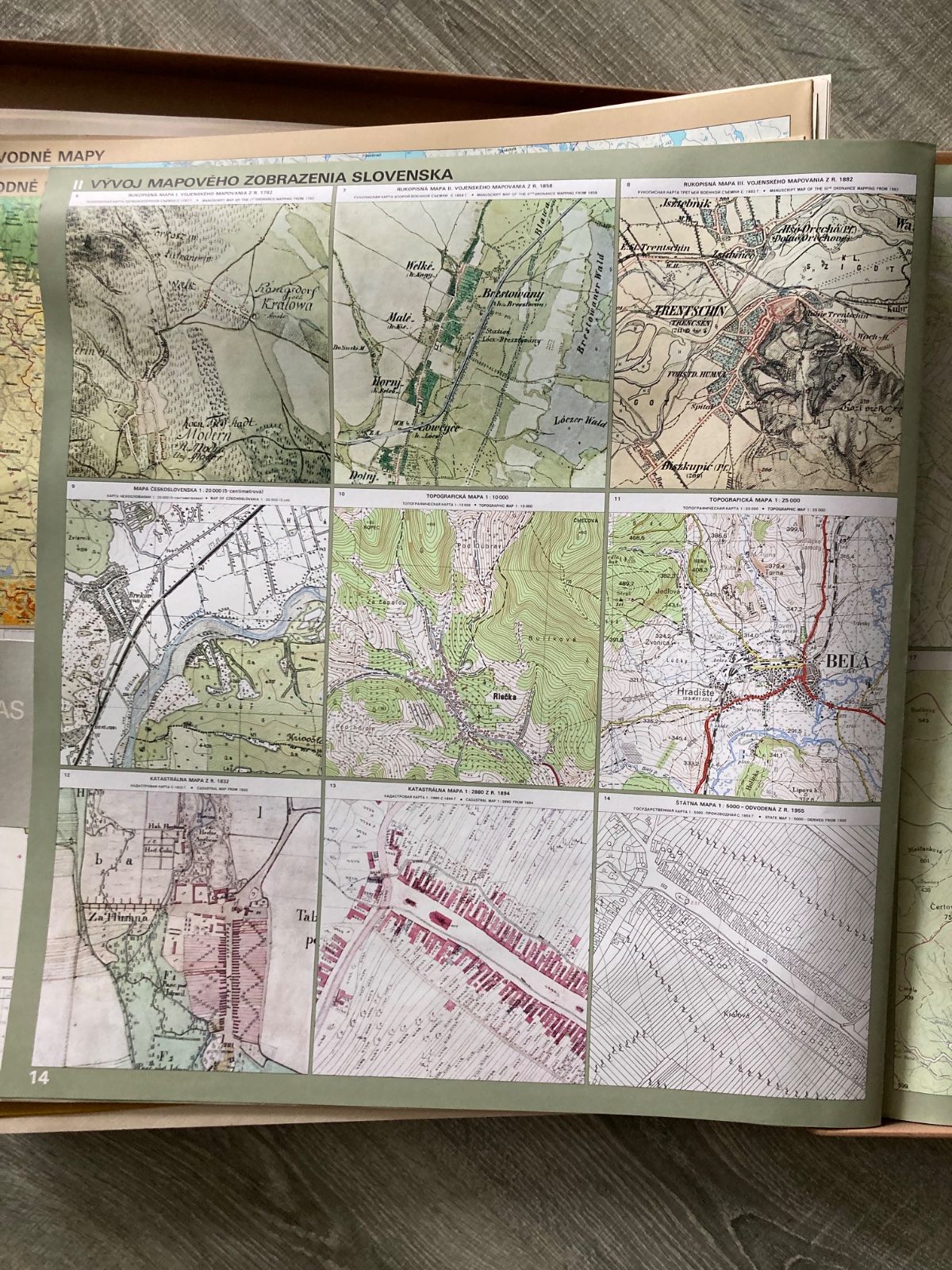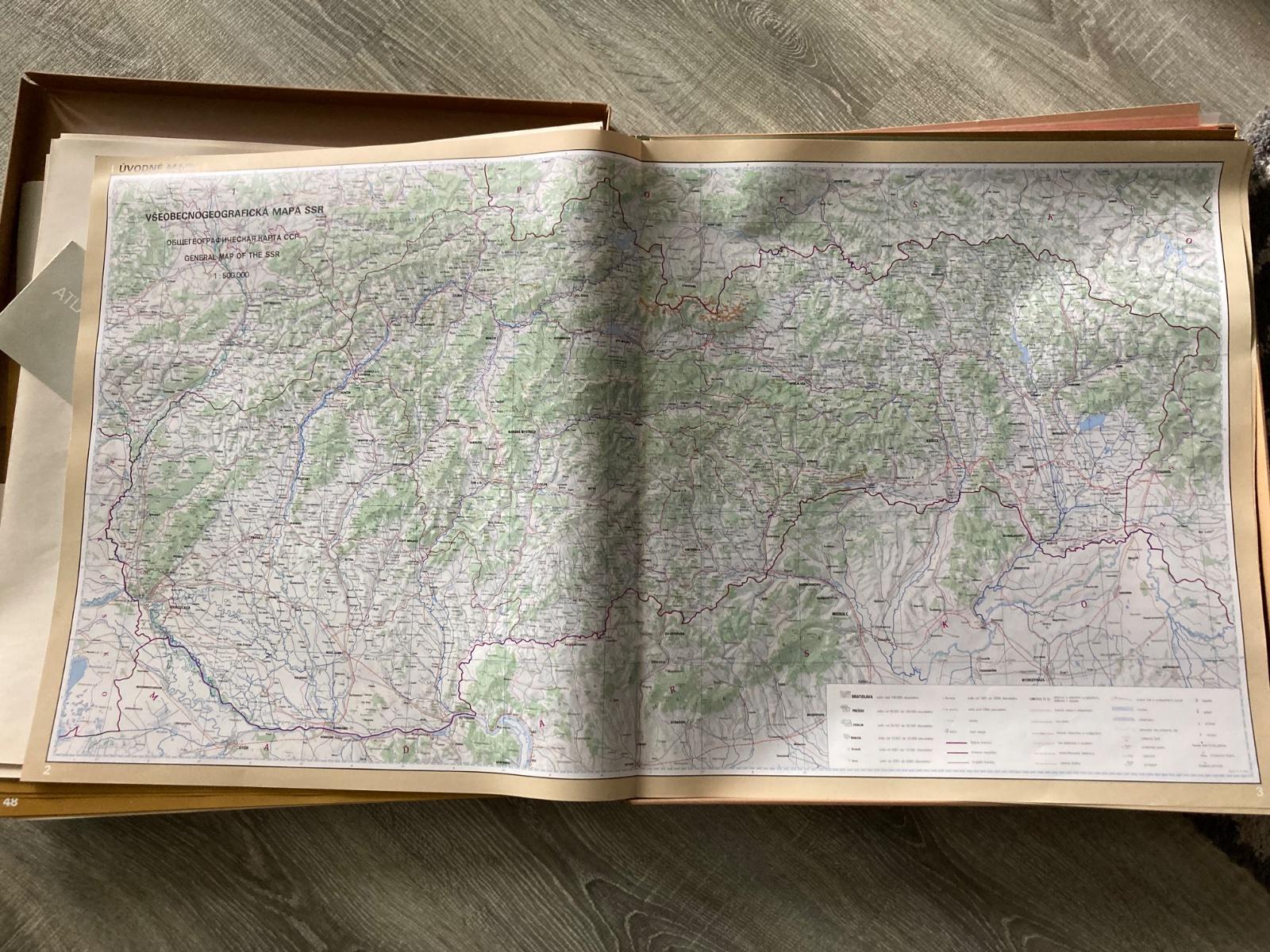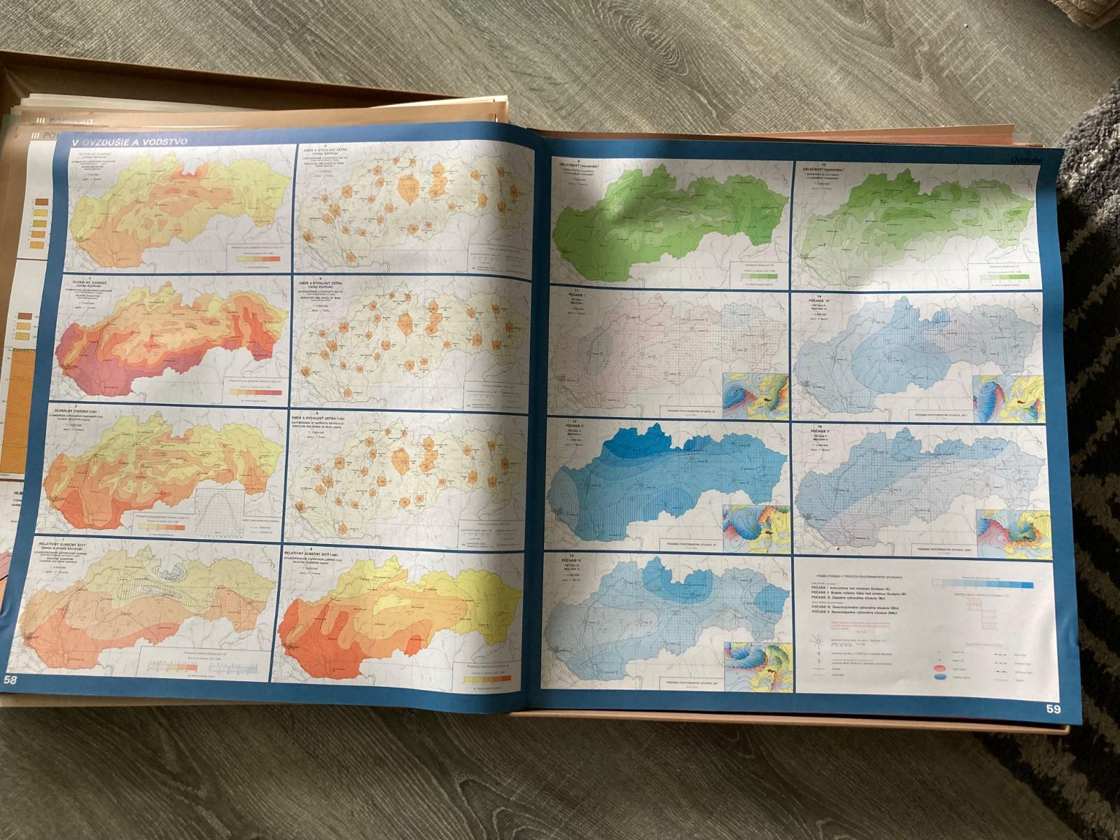 veľmi pekný stav, starý súbor máp bez poškodení, len tvrdý obal mierne opotrebovaný, Je to rozsiahly atlas s tvrdou väzbou, mapy sú zaradené do 15 sekcii, napr. Úvodné mapy, Vývoj mapového zobrazenia, Podklad, Povrch, Ovzdušie a vodstvo atď.