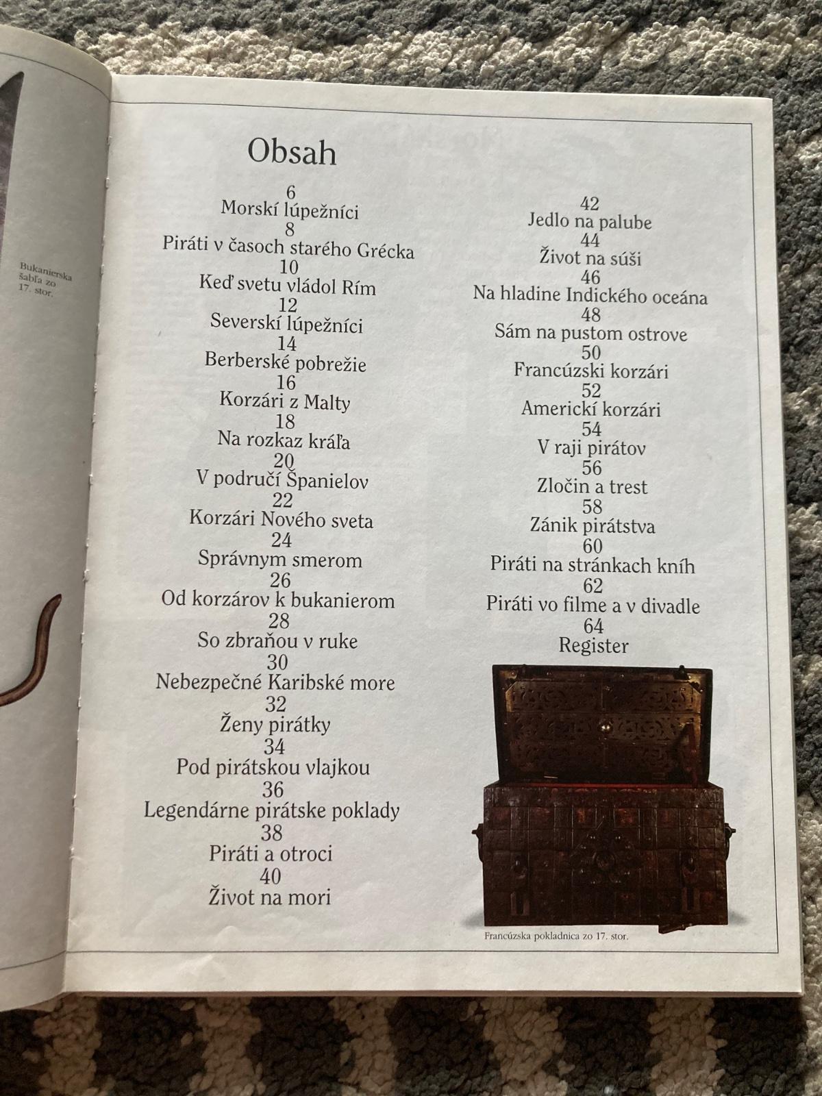 📌Kapitoly: Morskí lúpežníci, Piráti v časoch starého Grécka, Keď svetu vládol Rím, Severskí lúpežníci, Berberské pobrežie, Korzári z Malty, Na rozkaz kráľa, V područí Španielov, Korzári Nového sveta, Správnym smerom, Od korzárov k bukanierom, So zbraňou v ruke, Nebezpečné Karibské more, Ženy pirátky, Pod pirátskou vlajkou, Legendárne pirátske poklady...