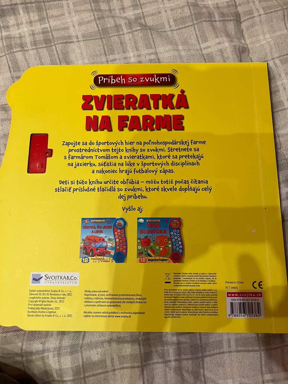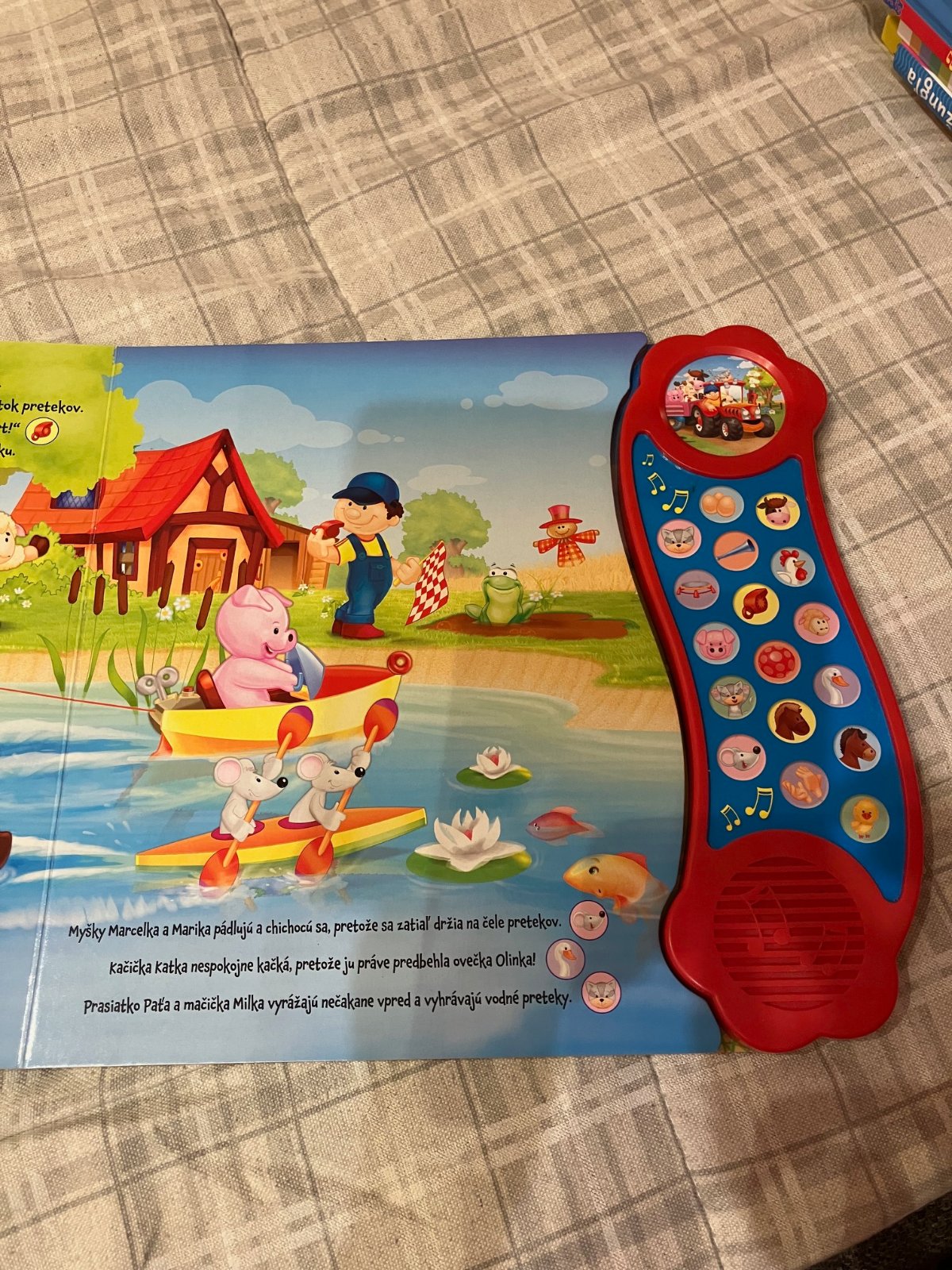 Na farme je krásny slnečný deň. Zvieratká sú pripravená na štarte dnes sa totiž konajú preteky na miestnom jazierku... Potom zvieratká súťažia v mnohých ďalších športových disciplínach na lúke prasiatko Paťa skáče na trampolíne, koník Krištof skáče cez prekážku, kravička Kamila vrhá oštepom... Všetky zvieratká sa pretekajú v behu s vajíčkom na lyžici a športový deň je zakončený futbalovým zápasom. Táto knižka s veselými celostránkovými ilustráciami obsahuje krátky príbeh plný zvieratiek i športových výkonov, a hlavne 18 zvukov, ktoré skvelo dopĺňajú dej príbehu. Deti si obľúbia čítanie veselého príbehu spoločne so stláčaním tlačidiel! Stačí len nájsť zodpovedajúci obrázok, stlačiť a ihneď sa prenesiete na farmu plnú zvukov!