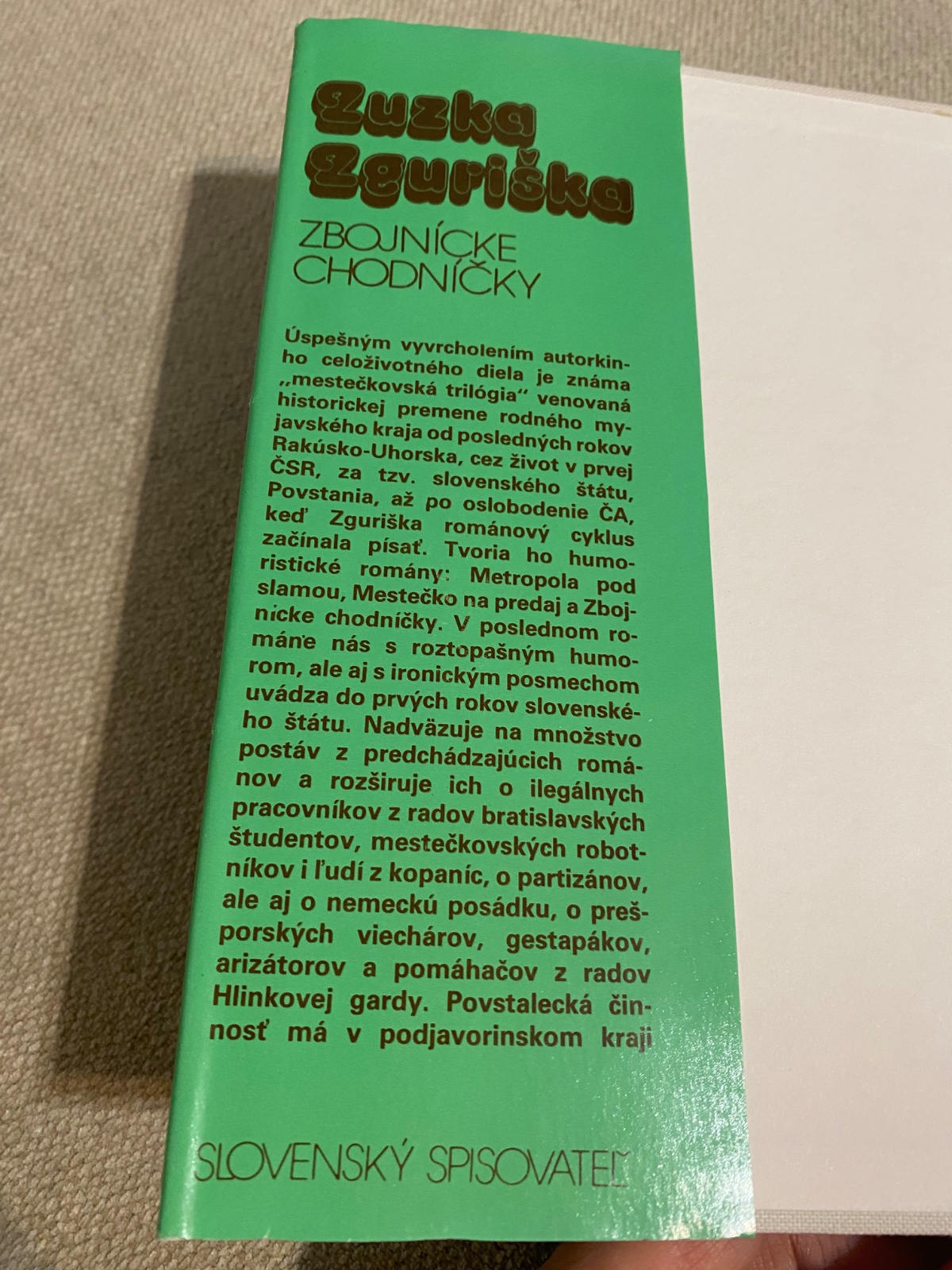 Úspešným vyvrcholením autorkin- ho celoživotného diela je známa ,,mestečkovská trilógia" venovaná historickej premene rodného my- javského kraja od posledných rokov Rakúsko-Uhorska, cez život v prvej ČSR, za tzv. slovenského štátu, Povstania, až po oslobodenie ČA, keď Zguriška románový cyklus začínala písať. Tvoria ho humo- ristické romány: Metropola pod slamou, Mestečko na predaj a Zboj- nicke chodníčky. V poslednom románe nás s roztopašným humo- rom, ale aj s ironickým posmechom uvádza do prvých rokov slovenského štátu. Nadväzuje na množstvo postáv z predchádzajúcich románov a rozširuje ich o ilegálnych pracovníkov z radov bratislavských študentov, mestečkovských robotníkov i ľudí z kopaníc, o partizánov, ale aj o nemeckú posádku, o prešporských viechárov, gestapákov, arizátorov a pomáhačov z radov Hlinkovej gardy. Povstalecká činnosť má v podjavorinskom kraji osobitý priebeh. Autorka priam s potešením zaznamenáva jeho drobnejšie súvislosti, vážne i veselo sleduje nitky vedúce do kopaničiarskych chalúp, do továrne i do samôt a vedie nás nocou polozabudnutými zbojníckymi chodníčkami, ktoré oddávna spájali Slovensko s Moravou a ktoré v čase odboja i Povstania znovu ožili. Aktérmi napínavých príhod sú okrem nám už známych aj noví hrdinovia: partizánsky veliteľ Jan- ko Riecky S bojovými druhmi, vysokoškolák Vlado Šimek s jeho snúbenicou, ktorú sa podarí vytrhnúť z rúk gestapáka Studkeho, zvláštna Merina Brožovská, redaktor Rimavský, ktorý sa rozide so svojou minulosťou a zapojí sa do protifašistickej činnosti. Okrem nich majú v románe dôležité úlohy Martin Duga a Pavel Čuvala a mnoho prostých ľudí z Mestečka kopaníc. Autorka načierala do udalostí tých čias plným priehrštím do humoru, ktorý je soľou života.