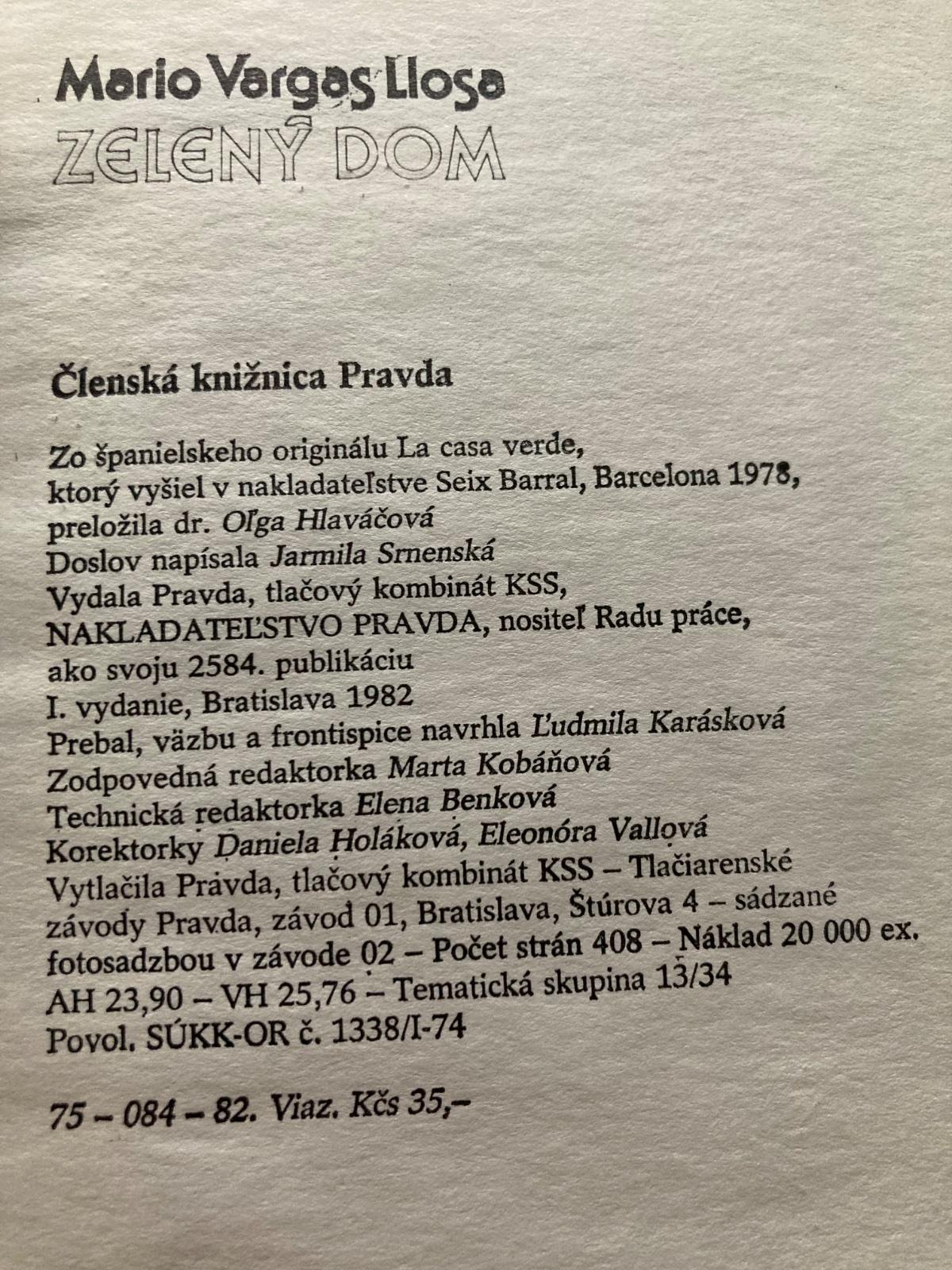 📌 V široko komponovanom románe "Zelený dom" sa autorovi pomocou originálnych rozprávačských postupov podarilo pôsobivo zachytiť strhujúci obraz života obyvateľov Piury, mestečka kdesi na severe, obklopeného piesočinami, a ľudí z povodia Amazonky. V Zelenom dome sa osudy jednotlivých postáv vzájomne ovplyvňujú, zbližujú, prepletajú, no vzápätí sú cudzie, vzdialené, čo si vyžaduje sústredenú pozornosť čitateľa, ktorý sa musí prehrýzť cez prvé kapitoly, no keď ich zdolá, už knihu neodloží, pretože kamienok po kamienku si sám skladá mozaiku ich života a dáva sa strhnúť spisovateľovým rozprávačským umením.
