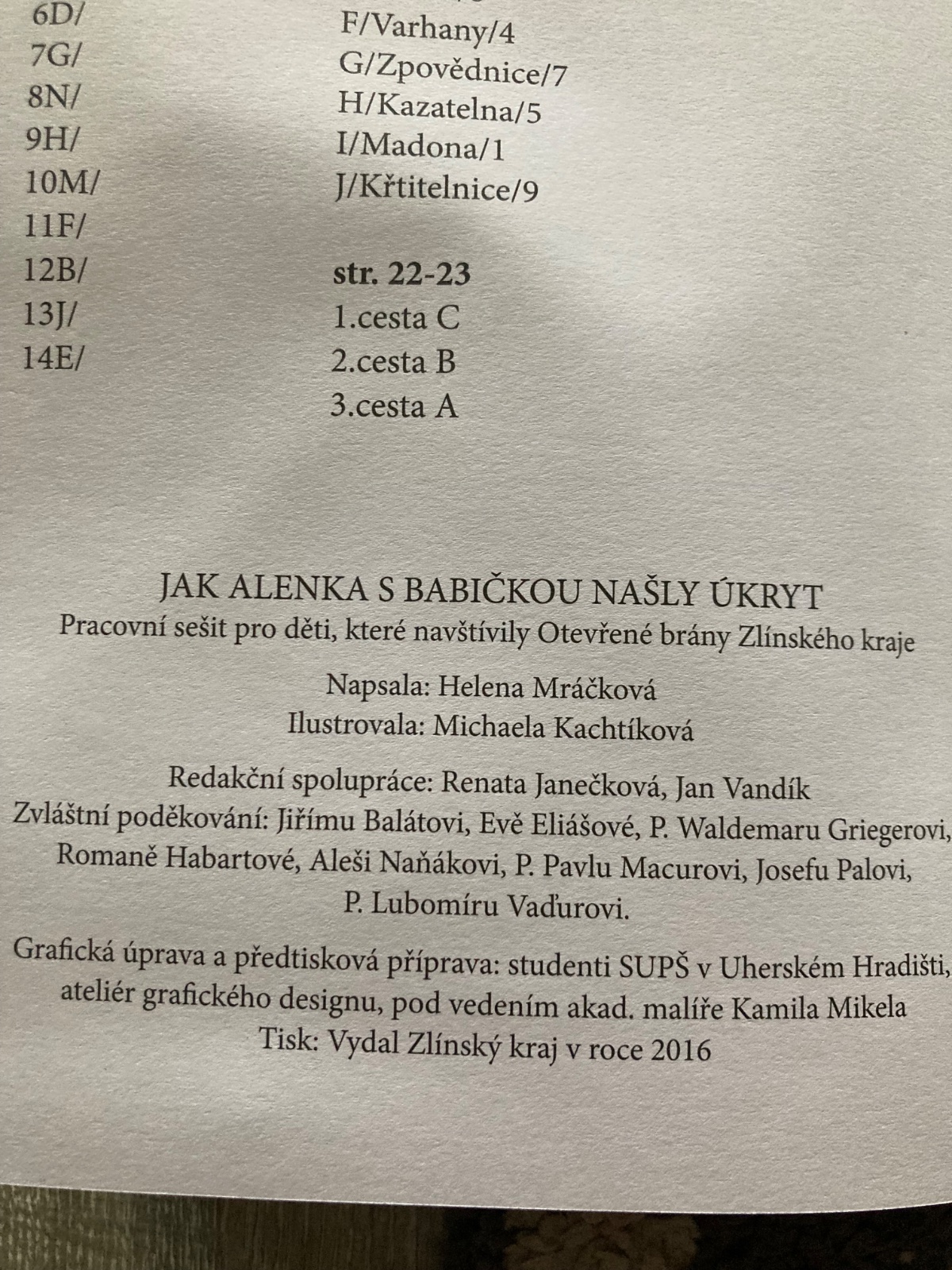 Jak Alenka s babičkou našly úkryt" (2016) je 21-stranový pracovní sešit pro děti vydaný Zlínským krajem v rámci projektu Otevřené brány. Publikace se zaměřuje na objevování sakrálních památek v regionu zábavnou formou, pravděpodobně autorky Mráčkové, a je dostupná v antikvariátech.