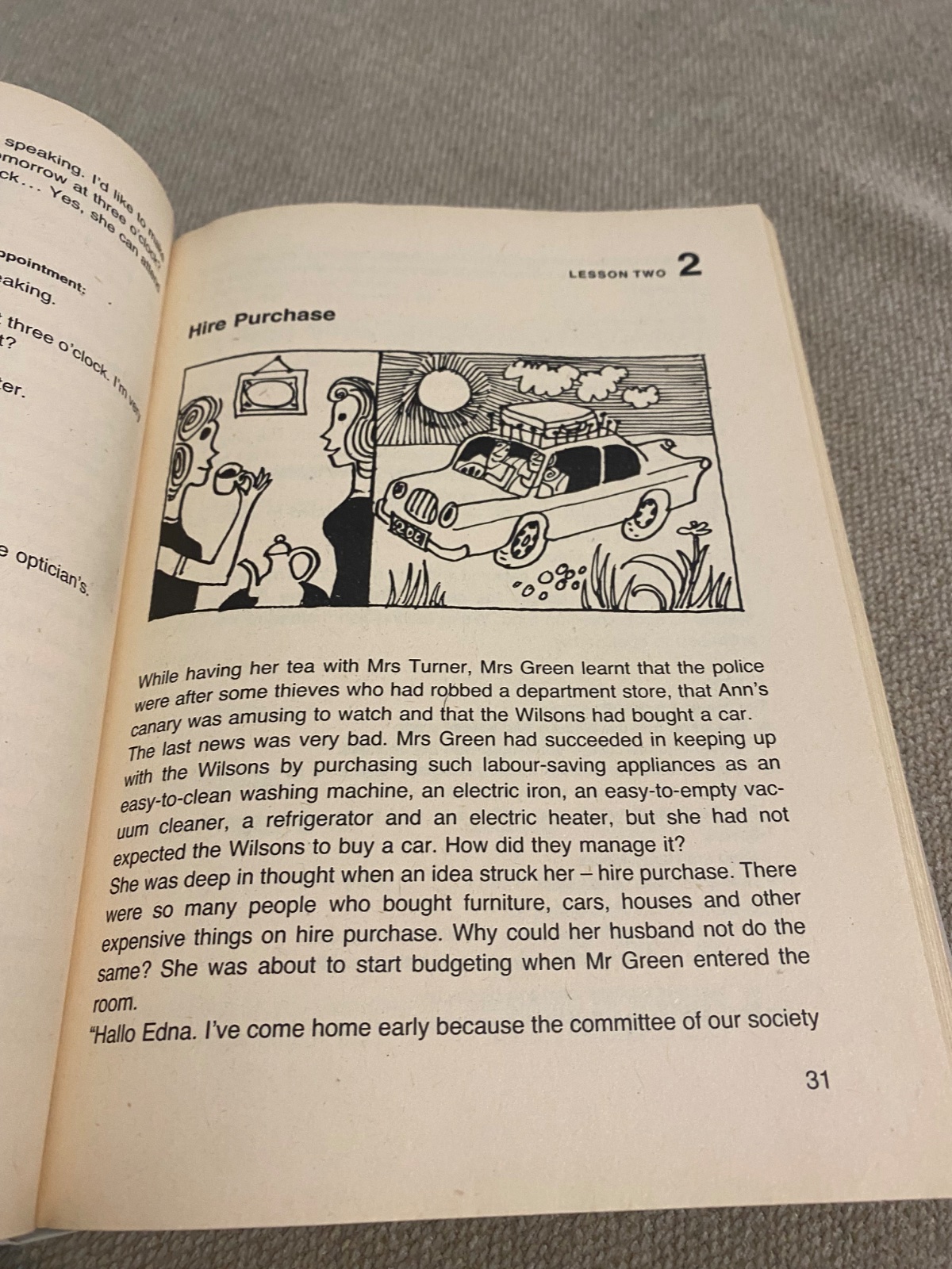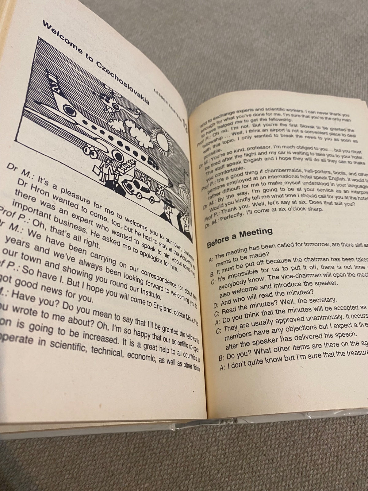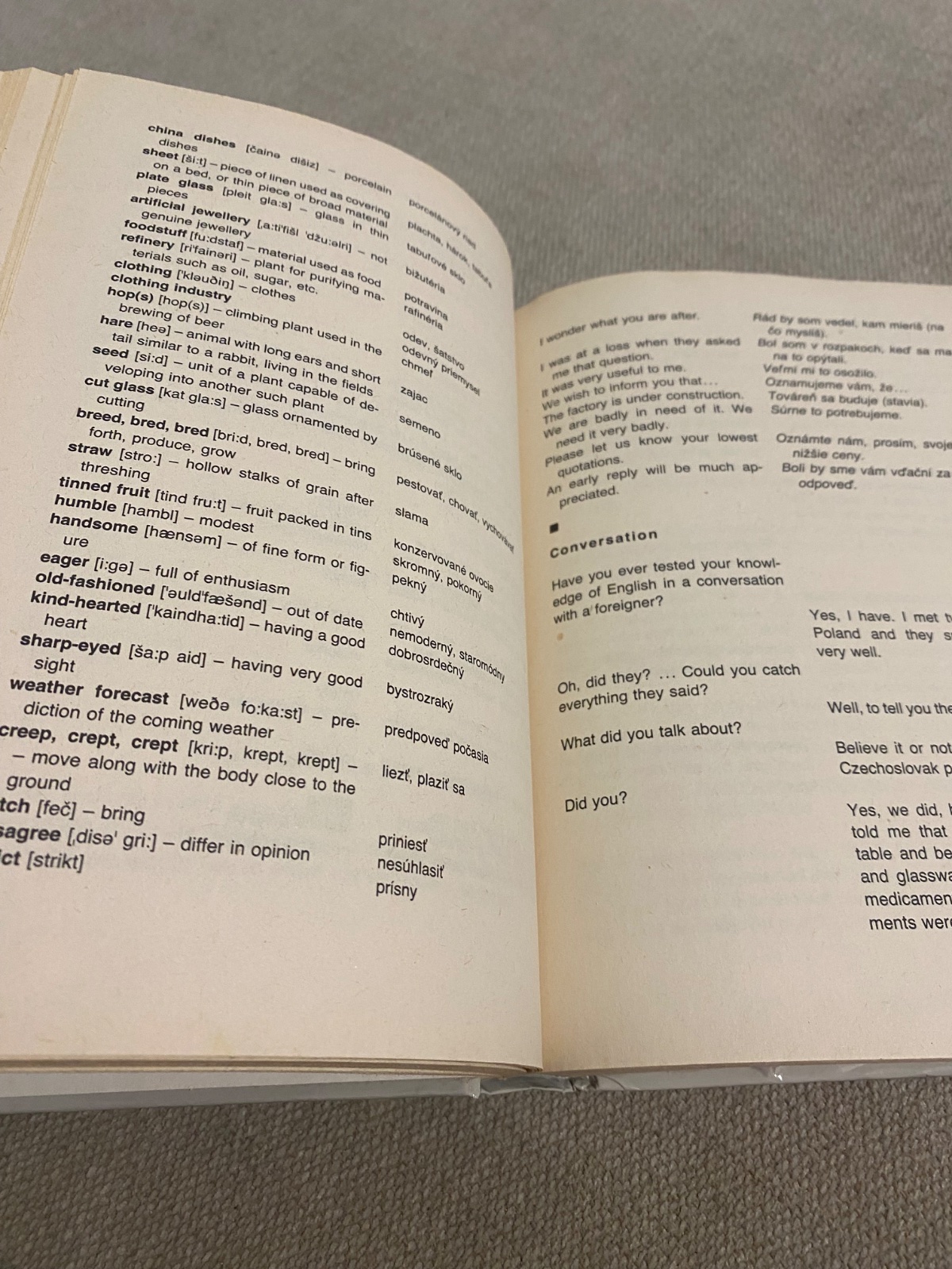 Konverzácia dopĺňa a precvičuje úvodnú tému. Upravili sme ju do stĺpcov, aby sa umožnilo čo najlepšie precvičenie. Najprv sa celý text prečíta, potom jeden poslucháč číta jeden stĺpec, zatiaľ čo druhý musí sám (bez čítania) konverzáciu dopĺňať. (Prvý poslucháč musí vlastnými slovami nadviazať na písaný text, ak sa jeho partner náhodou od danej témy vzdialil.)