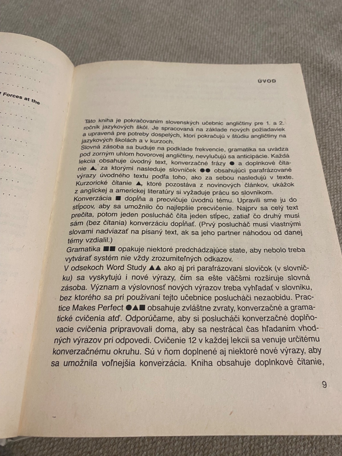 V odsekoch Word Study ako aj pri parafrázovaní slovíčok (v slovníč- ku) sa vyskytujú i nové výrazy, čím sa ešte väčšmi rozširuje slovná zásoba. Význam a výslovnosť nových výrazov treba vyhľadať v slovníku, bez ktorého sa pri používaní tejto učebnice poslucháči nezaobídu. Prac- tice Makes Perfect obsahuje zvláštne zvraty, konverzačné a grama- tické cvičenia atď. Odporúčame, aby si poslucháči konverzačné doplňo- vacie cvičenia pripravovali doma, aby sa nestrácal čas hľadaním vhod- ných výrazov pri odpovedi. Cvičenie 12 v každej lekcii sa venuje určitému konverzačnému okruhu. Sú v ňom doplnené aj niektoré nové výrazy, aby sa umožnila voľnejšia konverzácia…