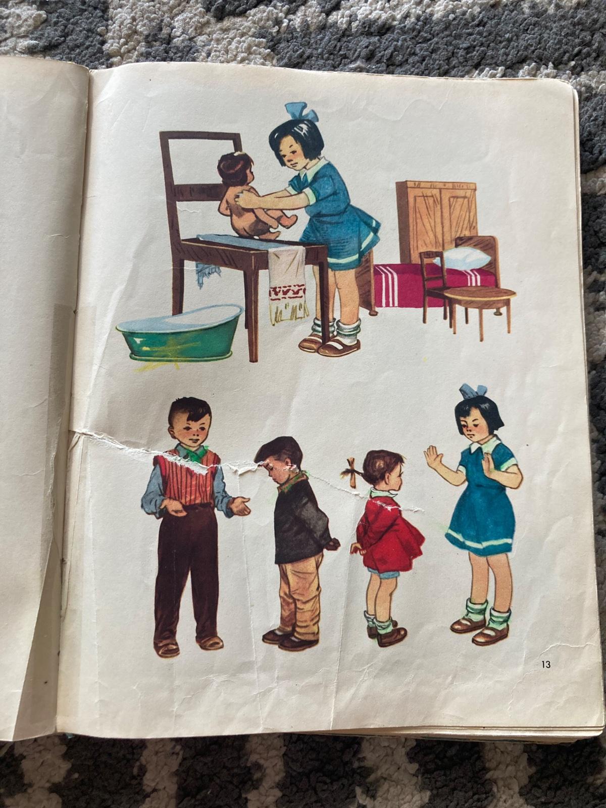 pekný stav, krásna stará učebnica z roku 1964, listy sú viac opotrebované, obsahuje pečiatky, niekoľko obrázkov je vyfarbených, inak bez vpisov, chýba jeden list úplne vpredu a ešte jeden list ( strana 61 a 62), nájde sa natrhnutie listov, je polepená priesvitnou páskou, obal je viac opotrebovaný