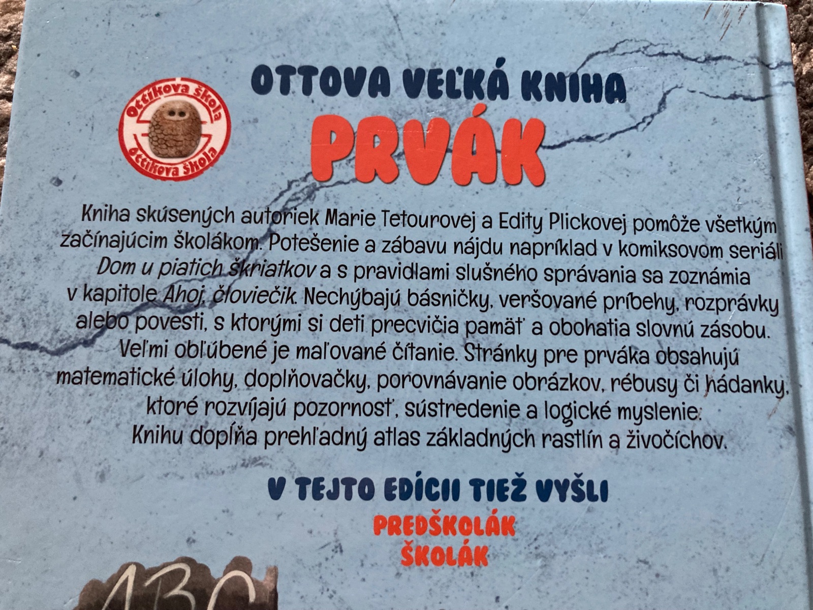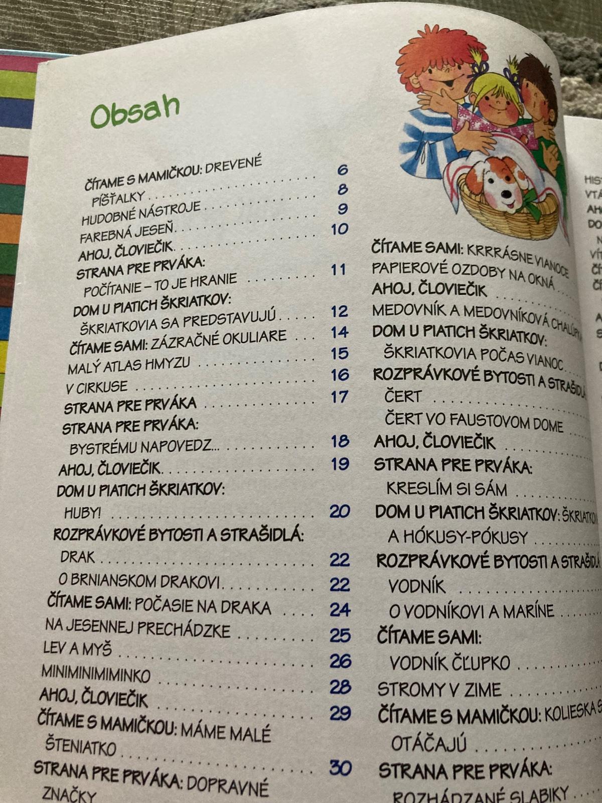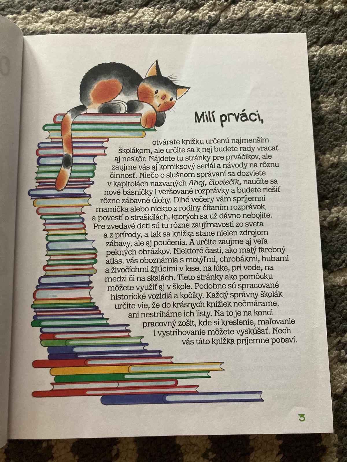 Kniha skúsených autoriek Marie Tetourovej a Edity Plickovej pomôže všetkým začínajúcim školákom. Potešenie a zábavu nájdu napríklad v komiksovom seriáli Dom u piatich škriatkov a s pravidlami slušného správania sa zoznámia v kapitole Ahoj, človiečik. Nechýbajú básničky, veršované príbehy, rozprávky alebo povesti, s ktorými si deti precvičia pamäť a obohatia slovnú zásobu. Veľmi obľúbené je aj maľované čítanie.