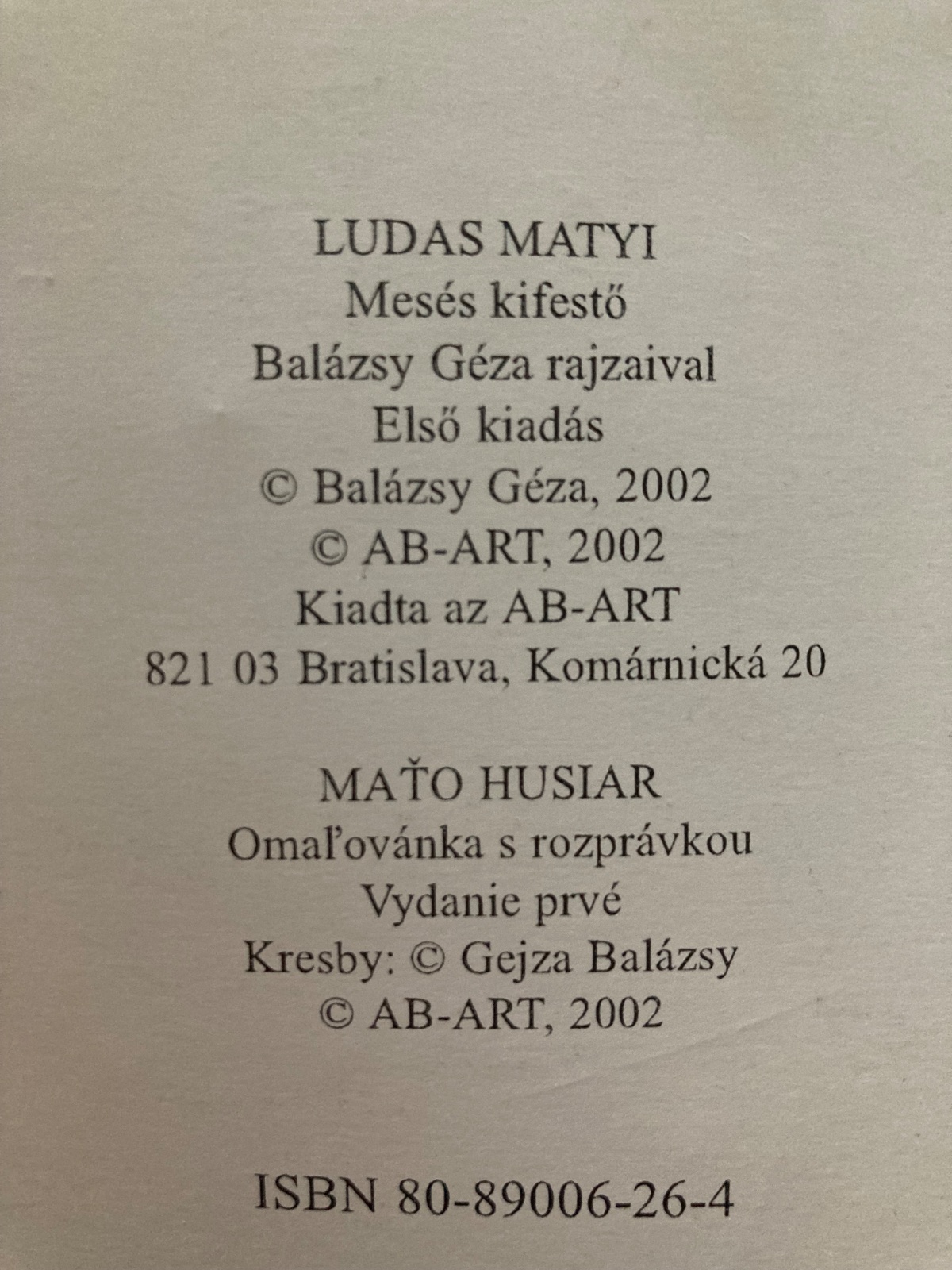 📌Vydavateľstvo AB-art (známe aj ako AB ART press) vydalo titul Lúdas Matyi ako ilustrovanú rozprávkovú omaľovánku pre deti v maďarskom jazyku.