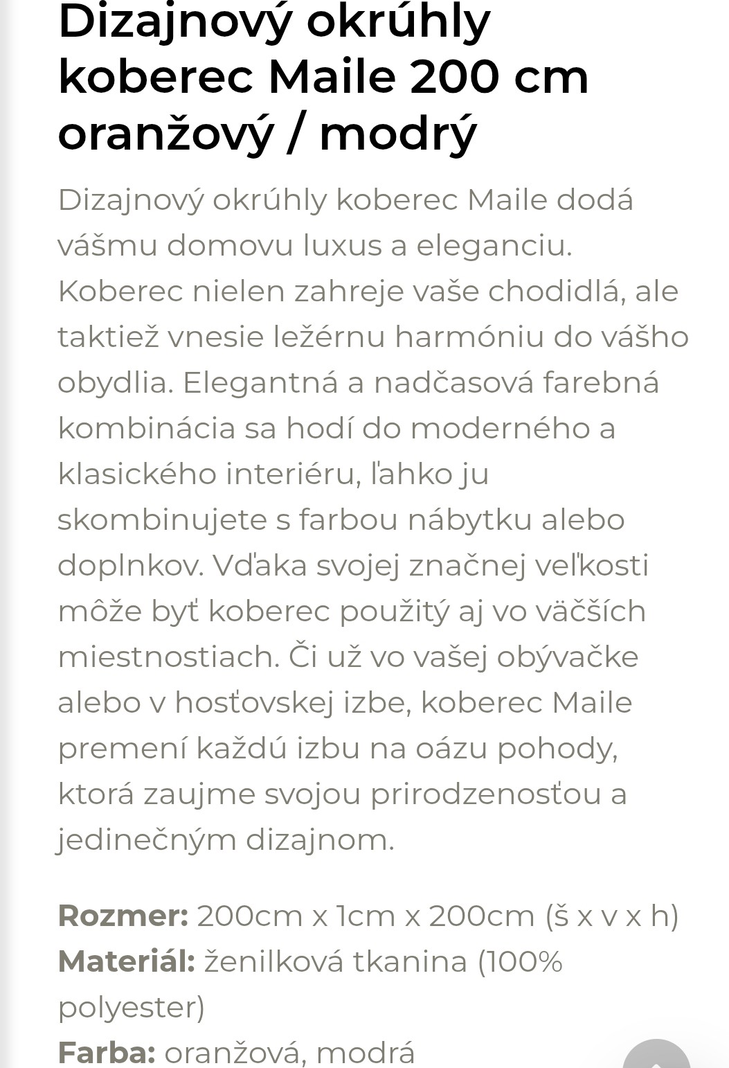 Predám krásny dekoračný koberček s priemerom približne 85cm. Je nepoužívaný, lebo sa nám farebne nehodí do bytu. Zloženie 55% bavlna a 45% polyakryl.