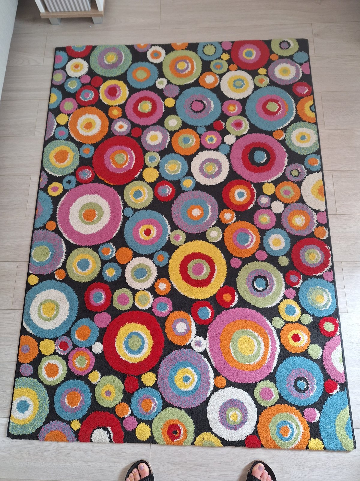 Predám kvalitný vlnený koberec, čierny podklad s farebnými vystúpenými krúžkami.