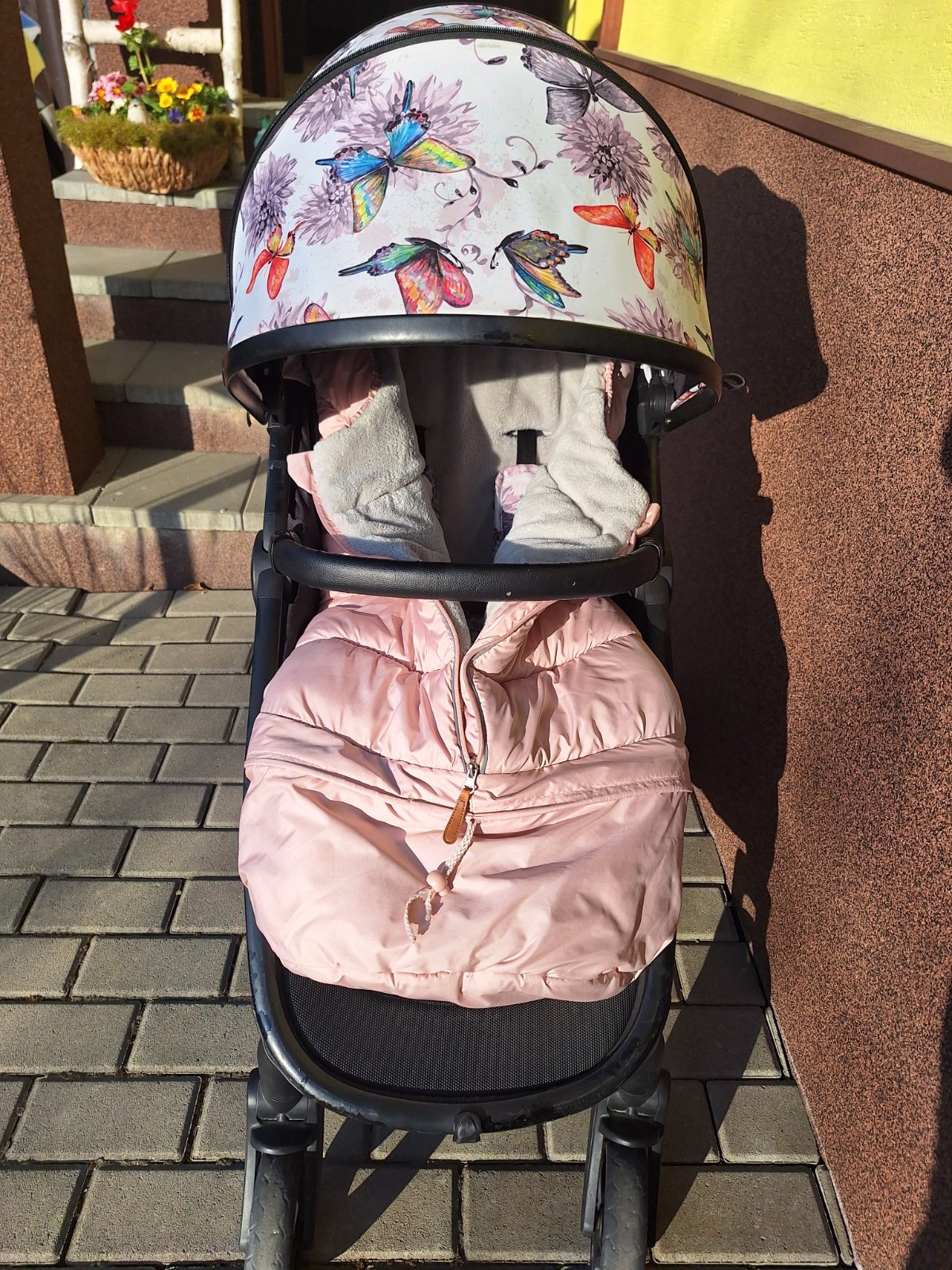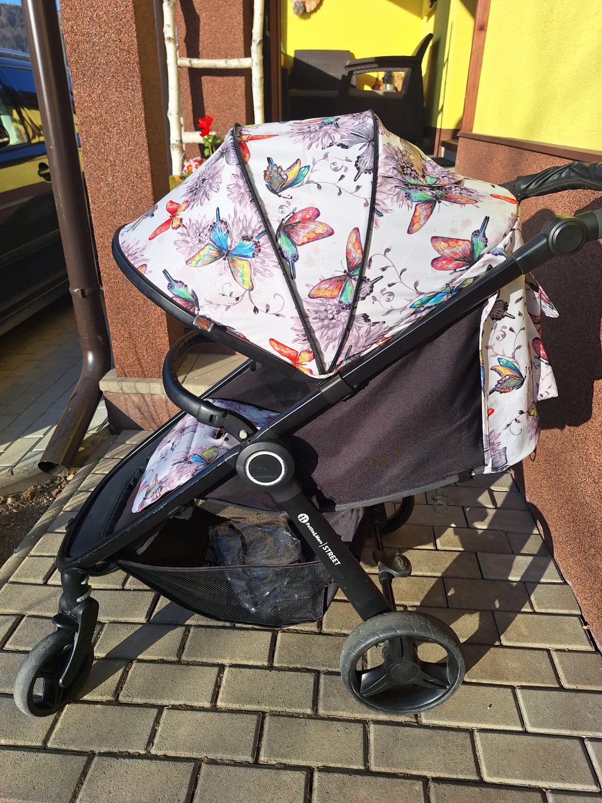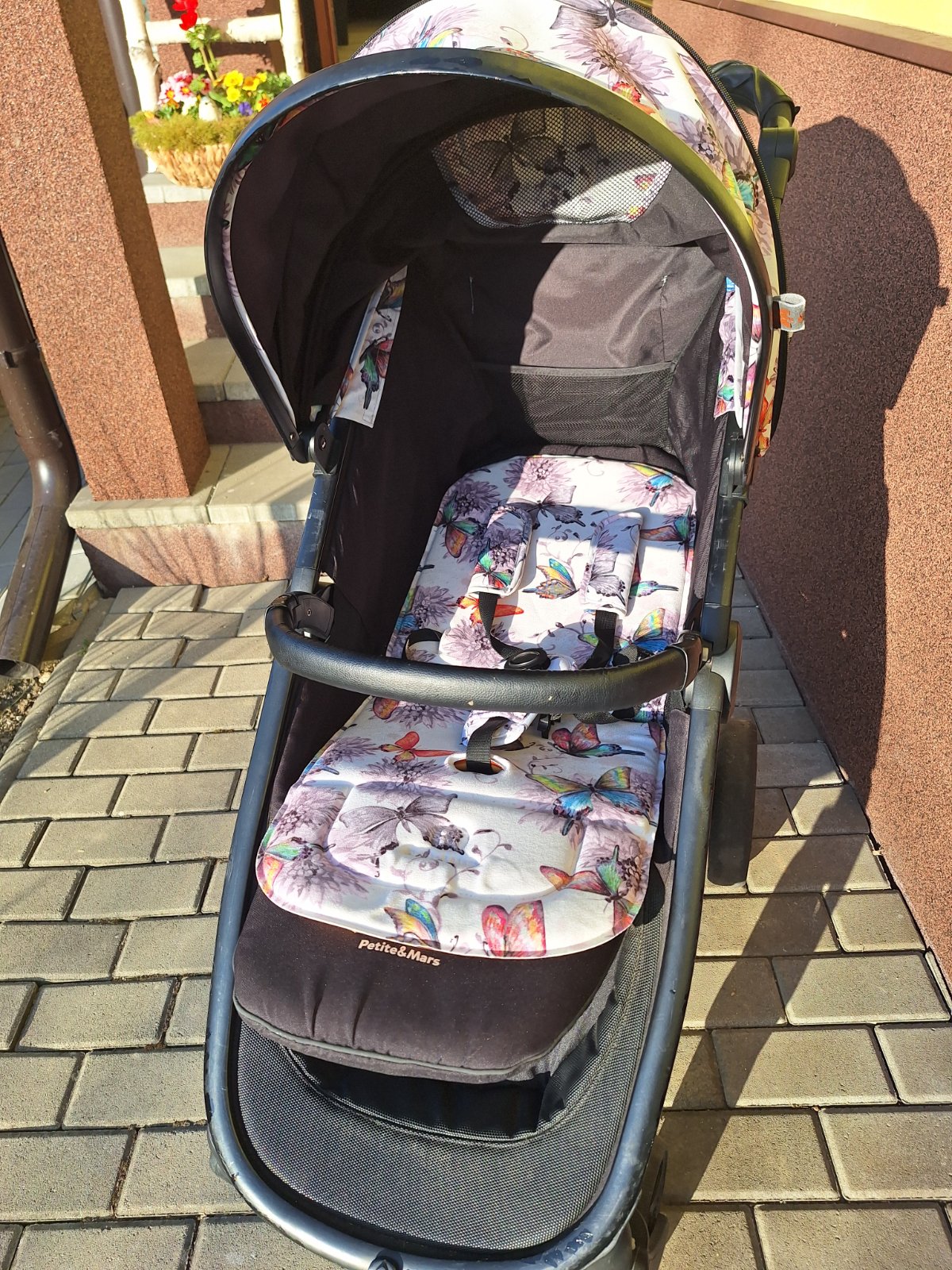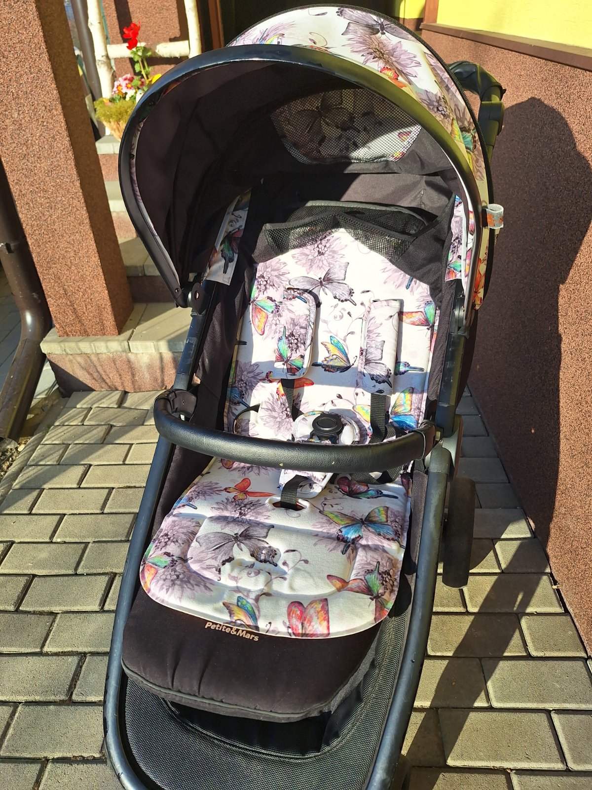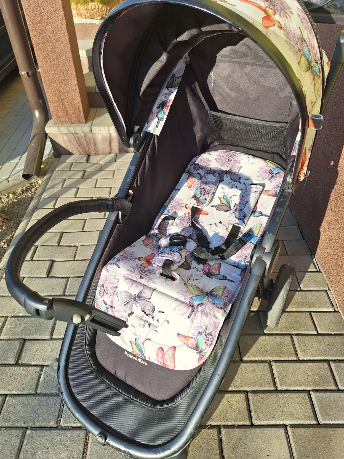 Preferujem osobný odber. Športový kočík Petite&mars street limitovaná edícia Motýle. Pevné plastové otočné kolieska, nastaviteľný od sedu do úplného ľahu, nastaviteľná rukoväť,priestranný košík na spodku, pláštenka. Ku kočiaru dávam rukavice a tašku grátis. Na predaj mám aj nánožník (10€) a teplý fusak (25€).