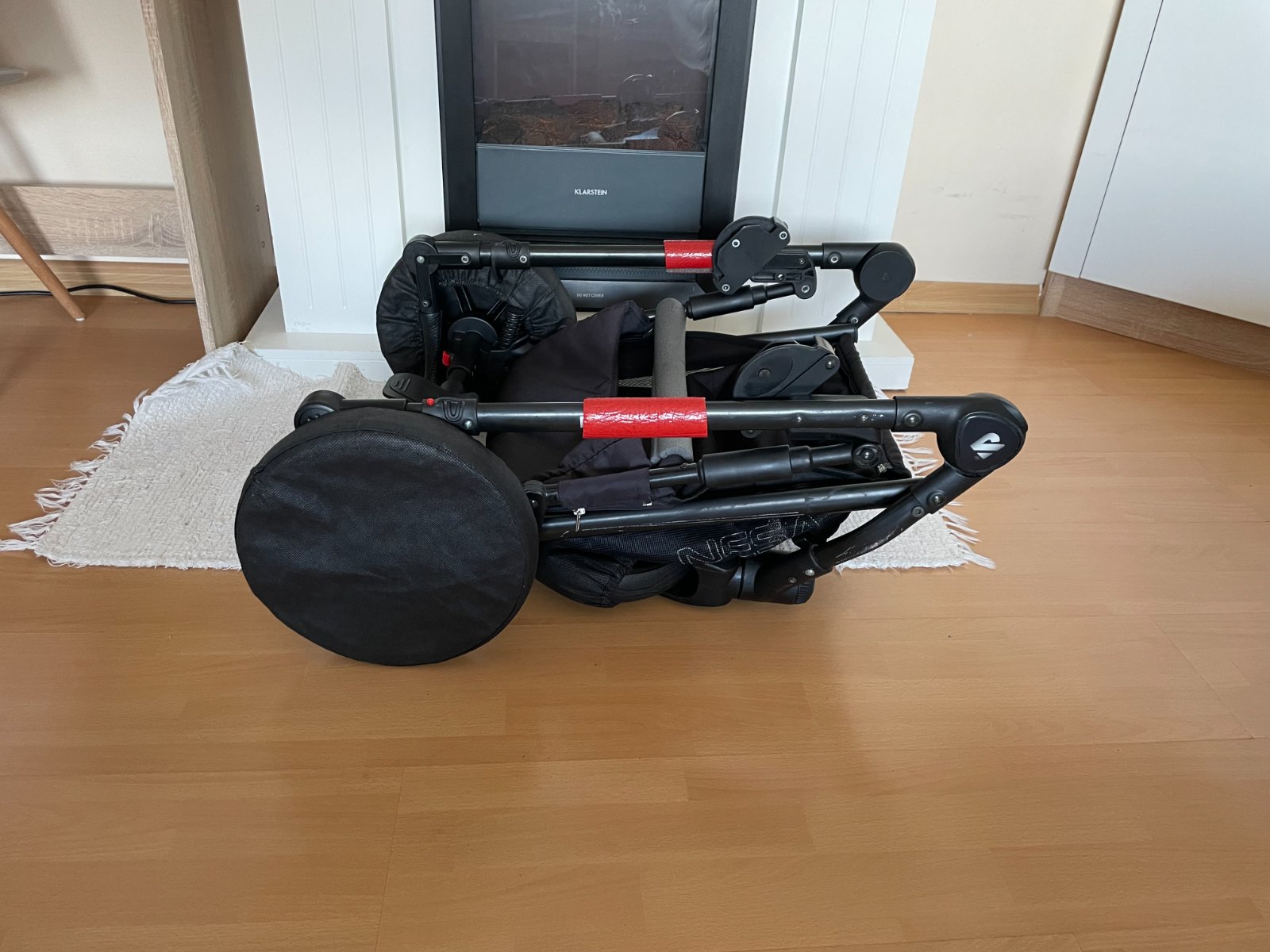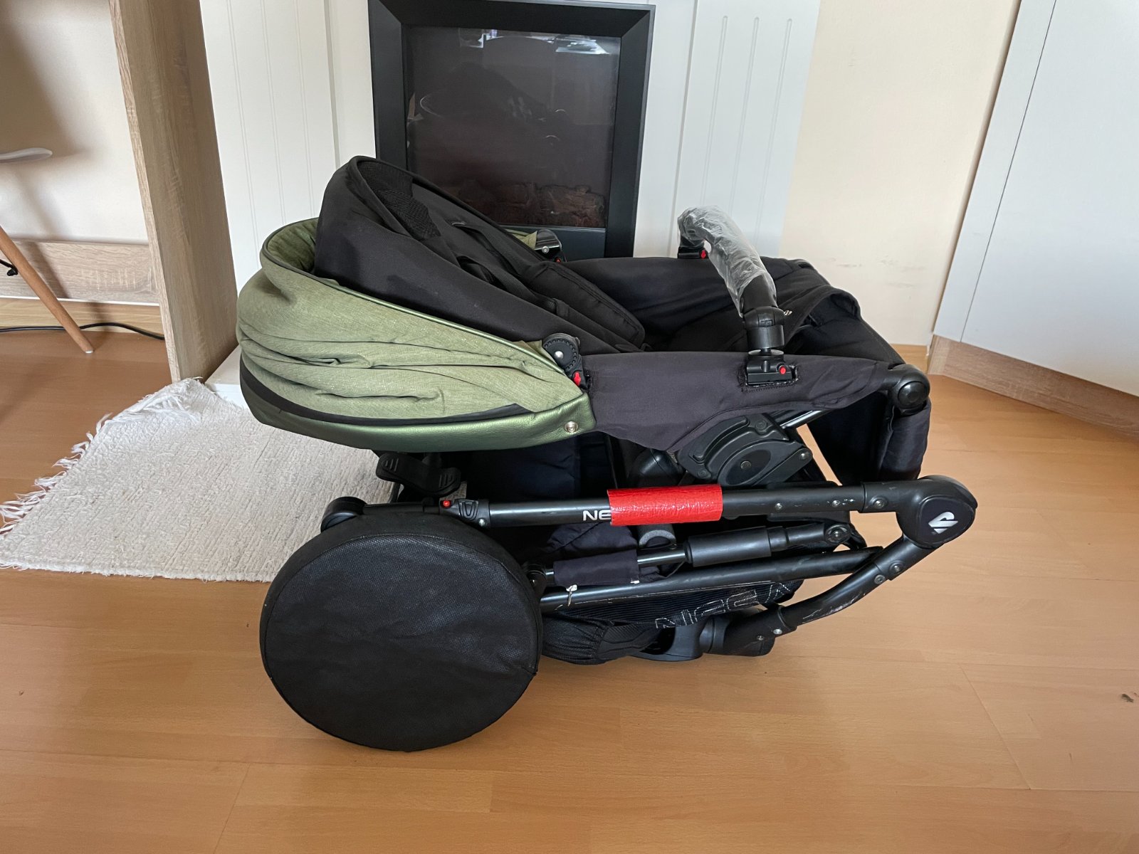 Riko Nesa je vybavený konštrukciou so zdvojeným odpružením a bezúdržbovými kolesami. Dizajn kočíka prináša trendovú kombináciu textílie a metalickej ekokože, veľkou výhodou je možnosť zloženia konštrukcie spolu so športovou sedačkou v jednom kuse(do auta, lietadla...) bežne známky opotrebenia, taška nie je v 100% stave - je opravená a funkčná, časť nákupného koša mierne poškodený čistením-jedna výstuha je na krajoch premočená, pôvodné balenie.