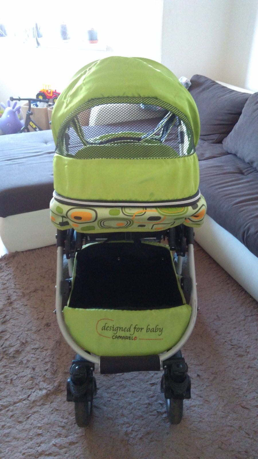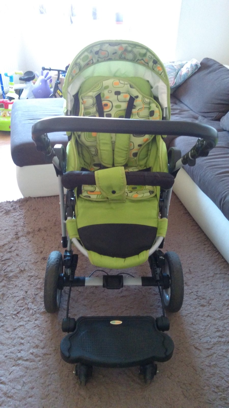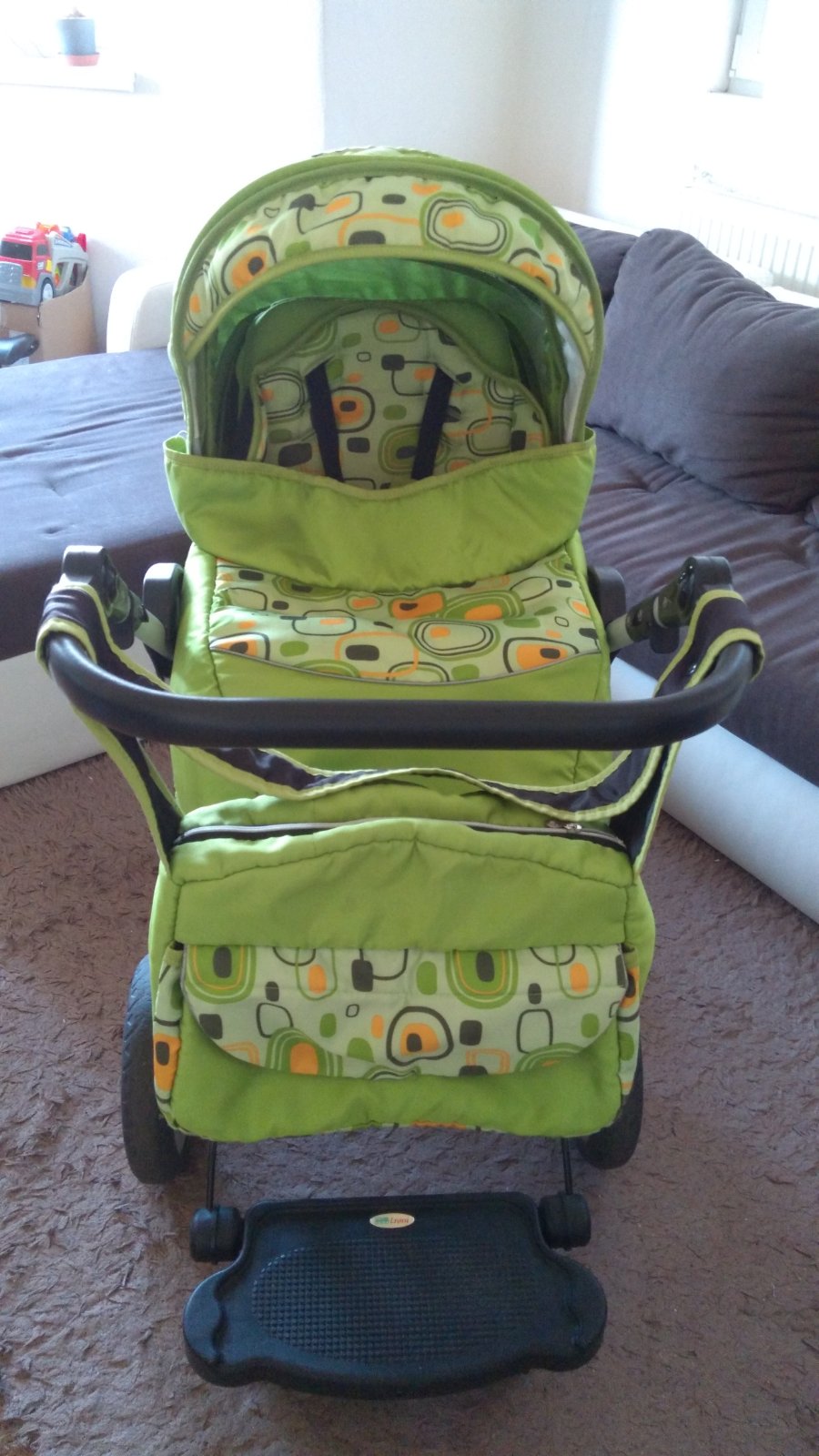 Kočík je vhodný aj pre väčšie deti, kolesá sú bezdušové ku každej časti je aj nánožník, veľká taška. Sú na ňom škrabance od skladania a vynášanie na poschodie viď foto, jedno tesnenie nám zmizlo pri skladaní ale sme to neriešili. Skejtbord je už predaný. Osobný odber alebo KN a Nesvady.