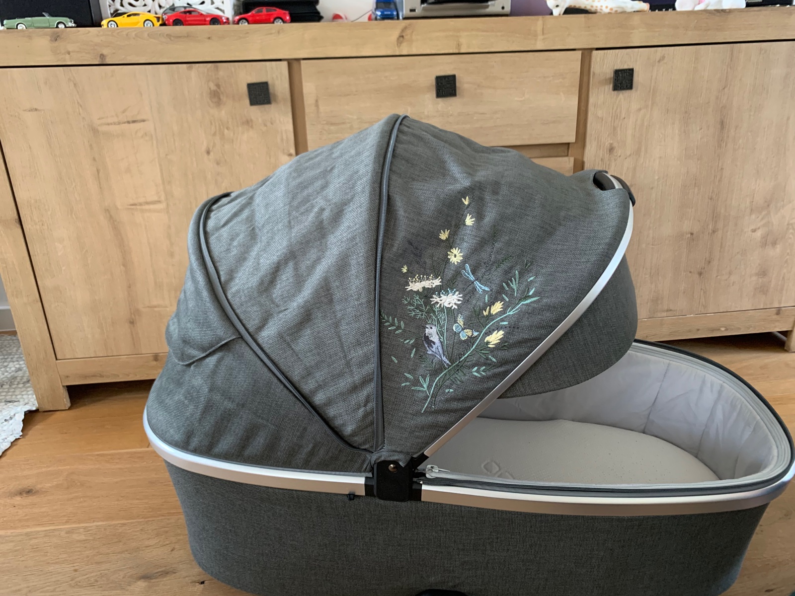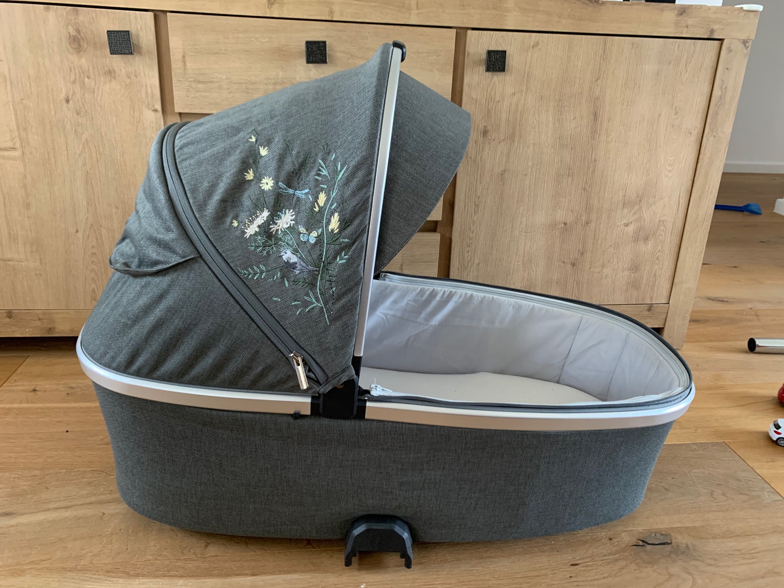 Vzory na kočíku sú vyšívané a nite výšivky sú vyrobené zo 100% drevnej celulózy – prírodného materiálu.