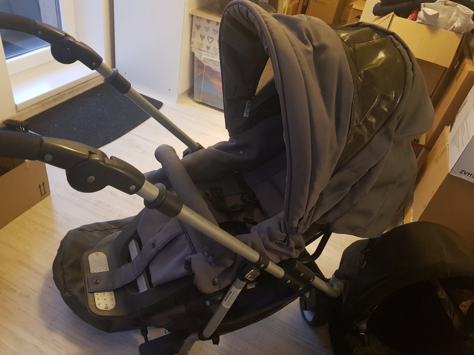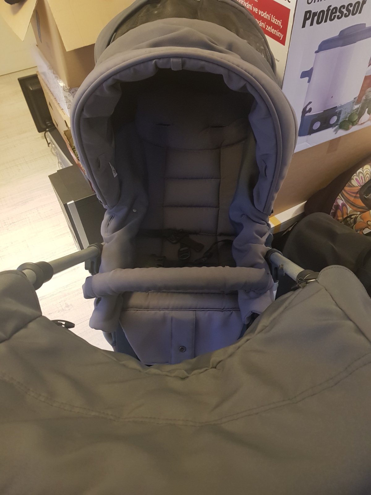 Kocik zn. Teutonia Fun, prsiplat, hlboka vanicka cierna, 2 sportove nasady na kocik-jedna siva a druha farebna, ku kazdej je original taska na kocik. Sportova cast: polohovatelne nozky aj chrbtova cast- 3 polohy. Poskodena penovka rukovate na kociku.